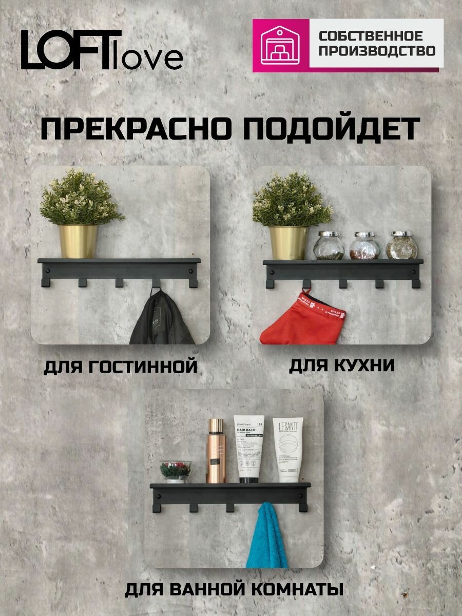 Полка с крючками, вешалка для ванной, кухни и прихожей 40 см металл чёрный информация: