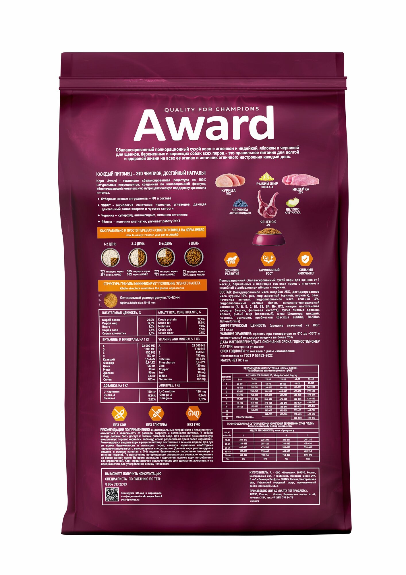 AWARD сухой корм для щенков всех пород от 1 месяца, беременных и кормящих сук, с ягненком, индейкой, яблоком и черникой - 2 кг информация: