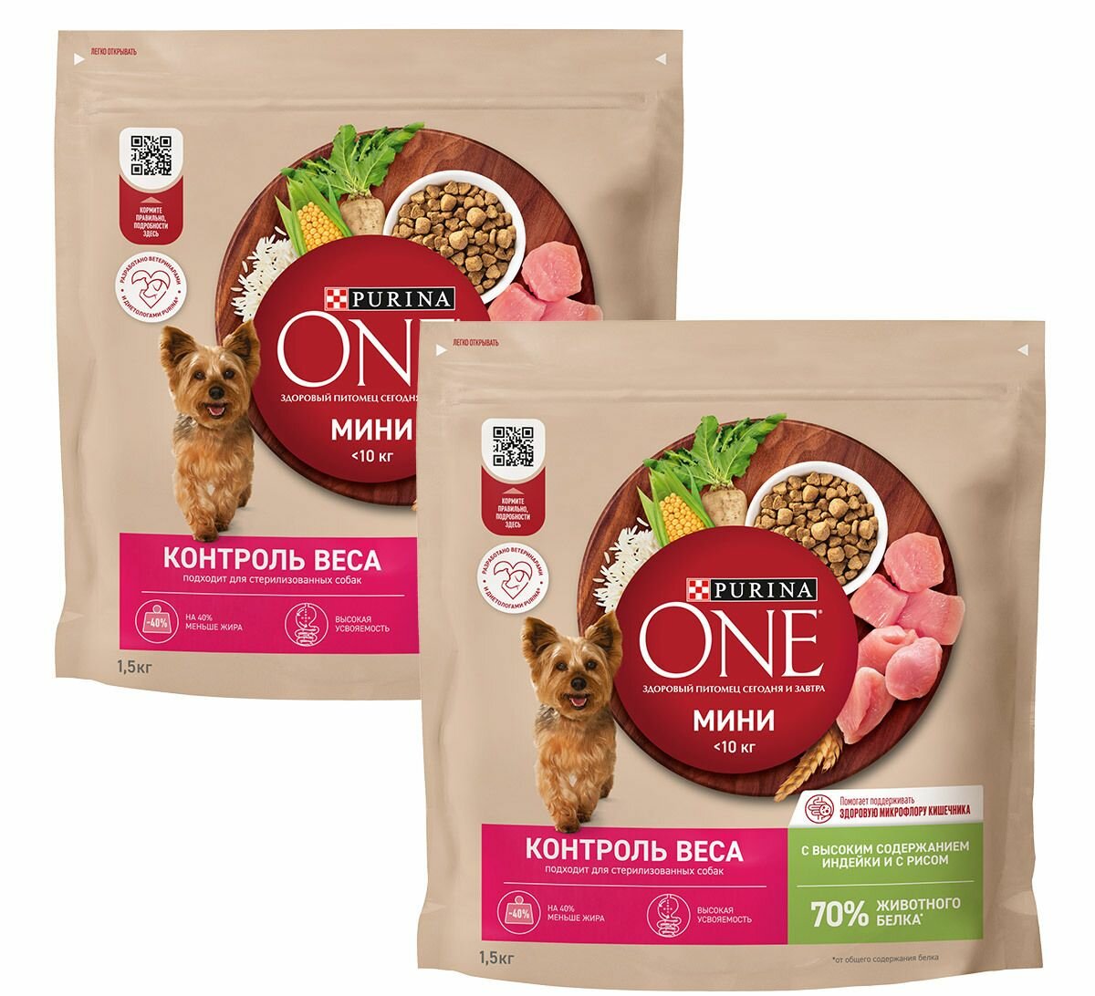 Набор 2х1,5кг Purina One для собак! 1,5 кг Сухой корм для взрослых собак мелких и карликовых пород индейка и рис 1,5 кг