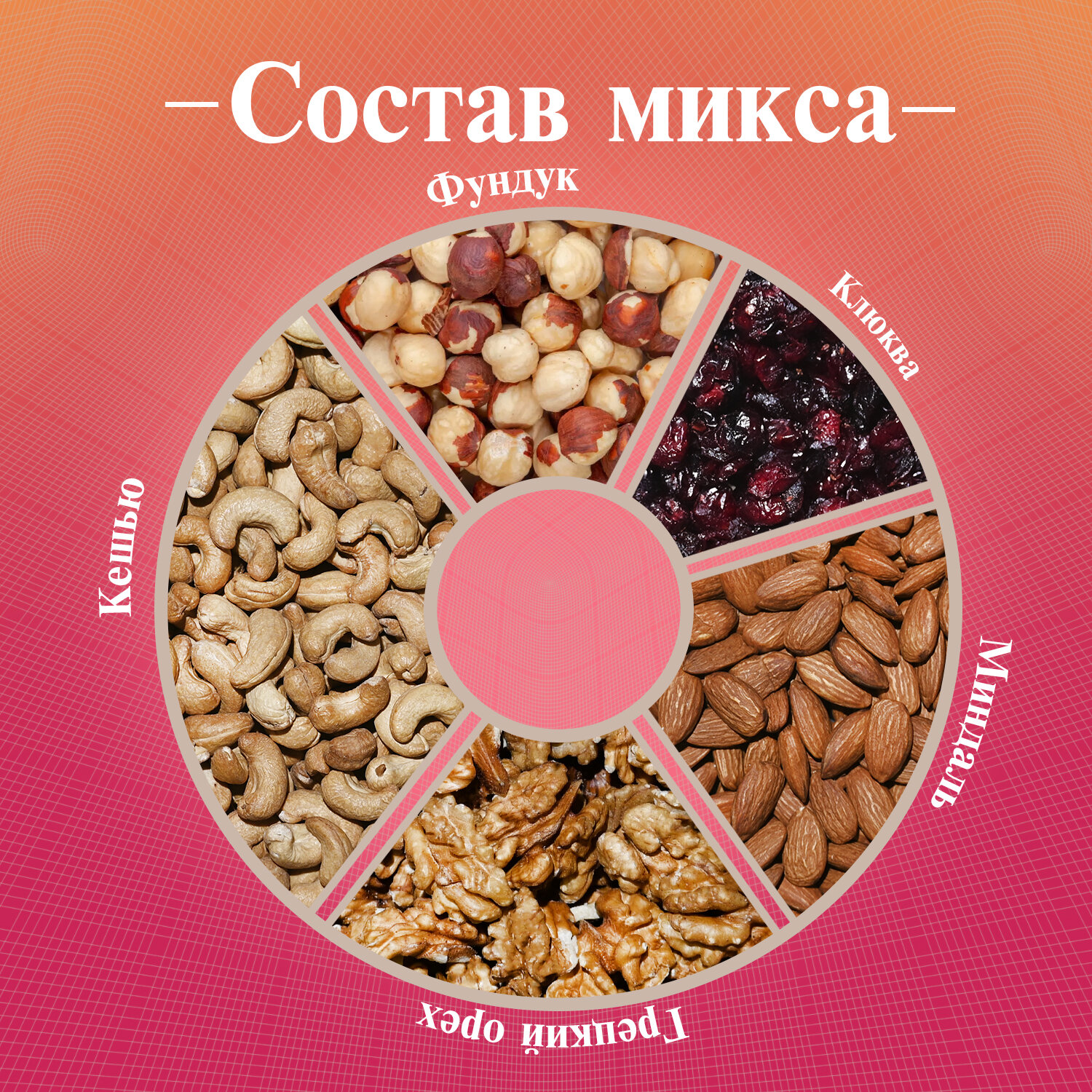 | Состав | кешью жареный, фундук жареный, миндаль жареный,грецкий орех, клюква вяленая |
