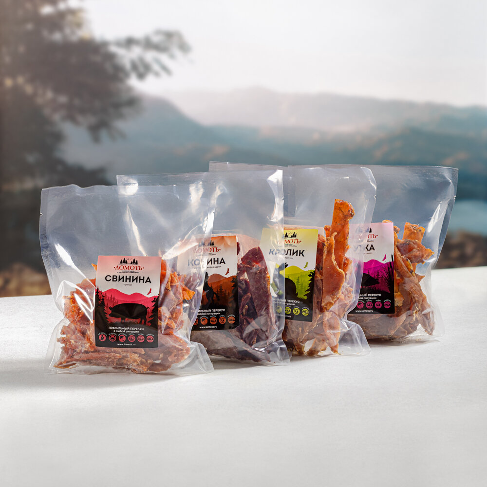 Отзывы на Вяленое мясо 1 кг Ассорти 2 (4 пакета по 250г) джерки Свинина Конина Кролик Утка