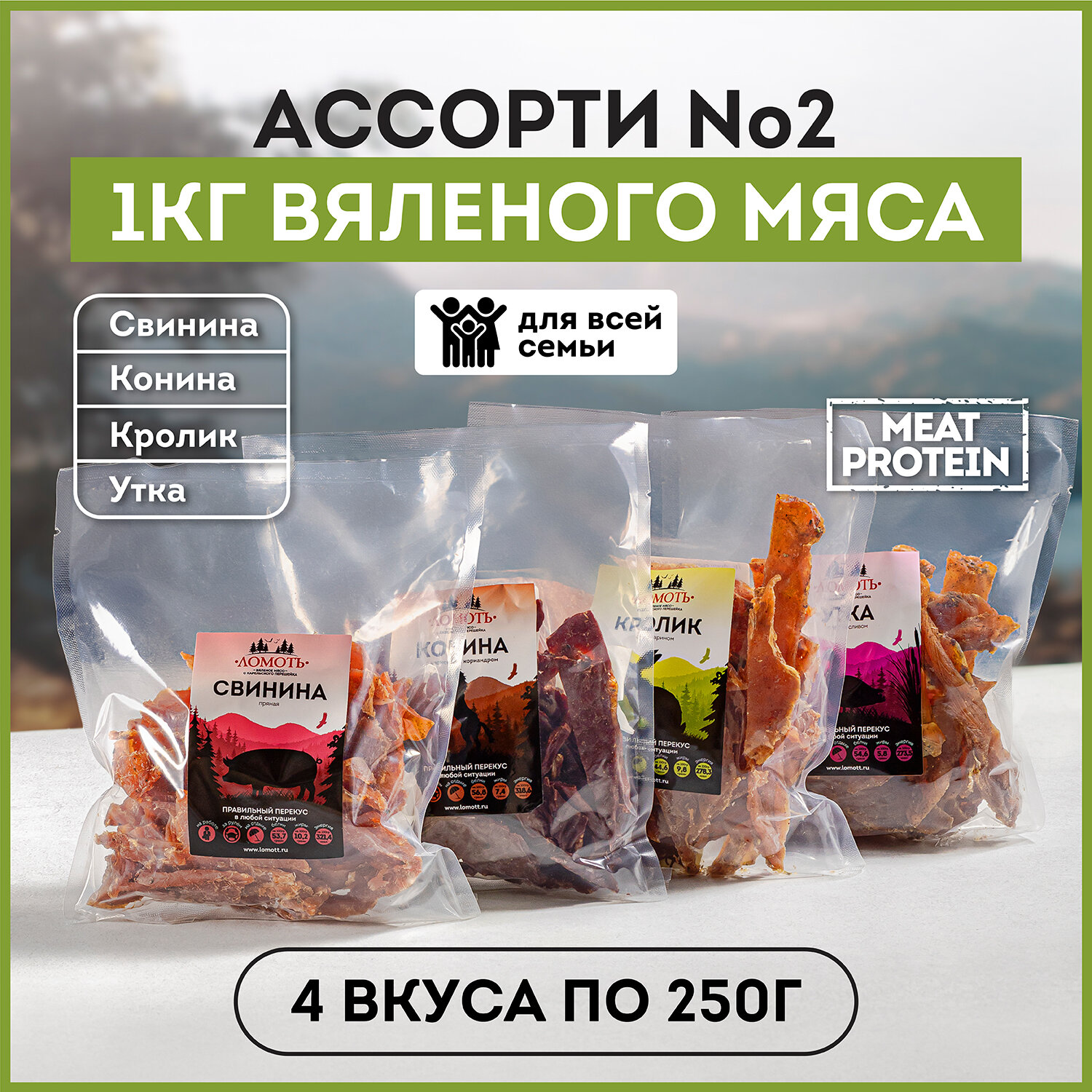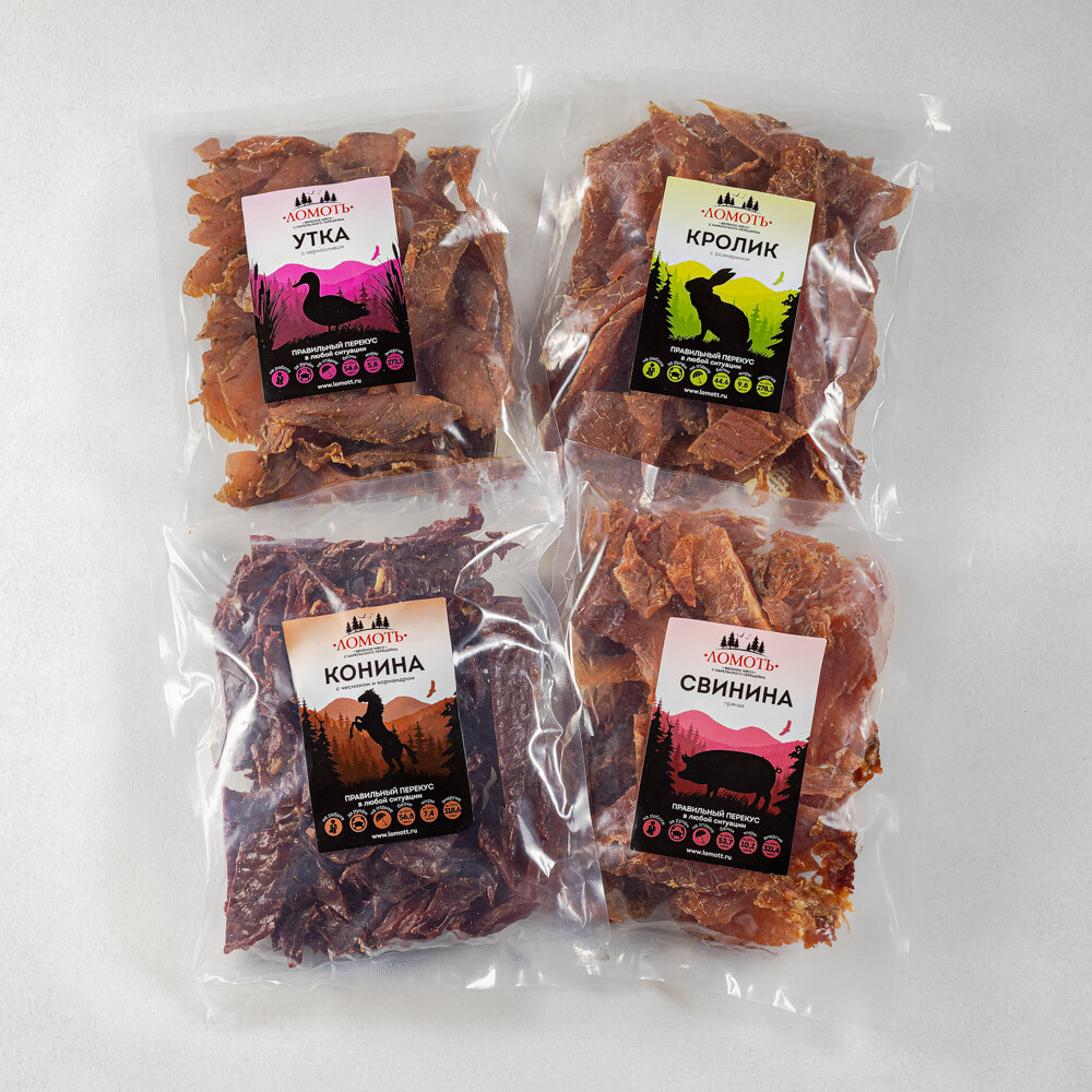 10 цен на Вяленое мясо 1 кг Ассорти 2 (4 пакета по 250г) джерки Свинина Конина Кролик Утка