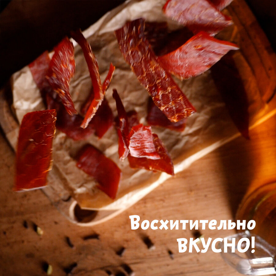 | Комплектация | семь порций сушеного мяса в вакуумных упакрвках, общий крафт пакет с многоразовой затежкой |