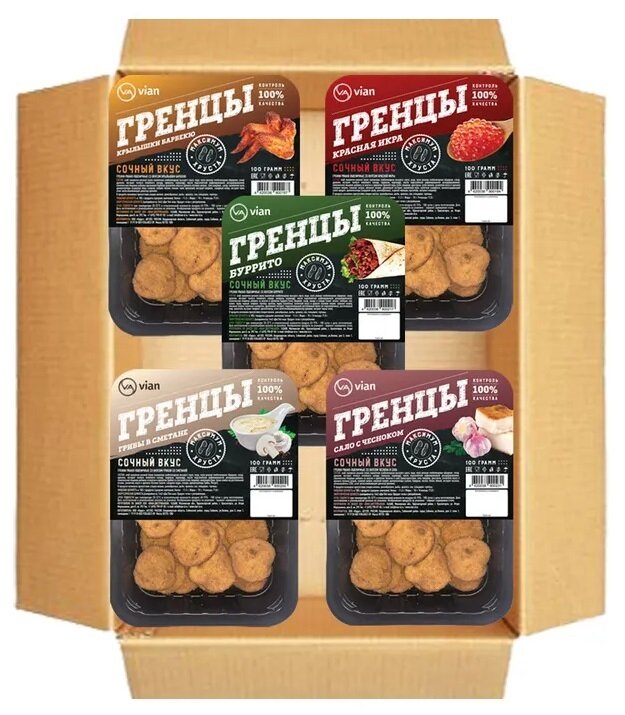 Гренки ржано - пшеничные микс "гренцы" VIAN (крылышки барбекю, красная икра, грибы со сметаной, буррито, сало с чесноком), 5 шт по 100 г информация: