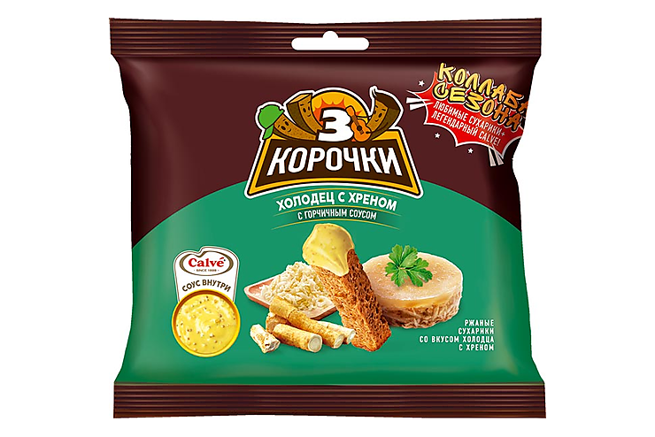 «3 Корочки», сухарики со вкусом холодца с хреном и горчичным соусом «Calve», 85 г, 4 штуки информация: