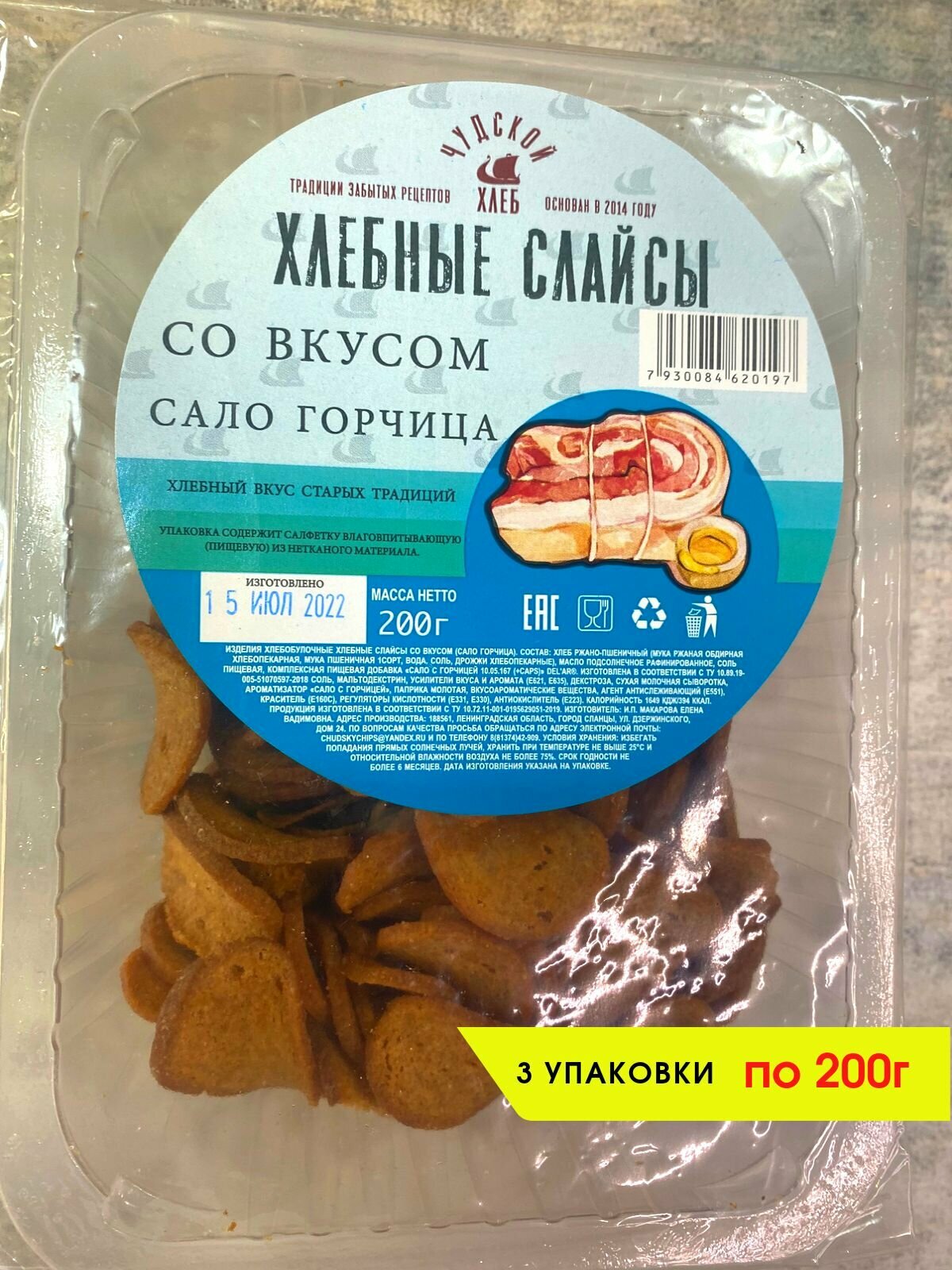 Сухари Хлебные слайсы со вкусом "Сало/горчица", 3 упаковки по 200 г. информация: