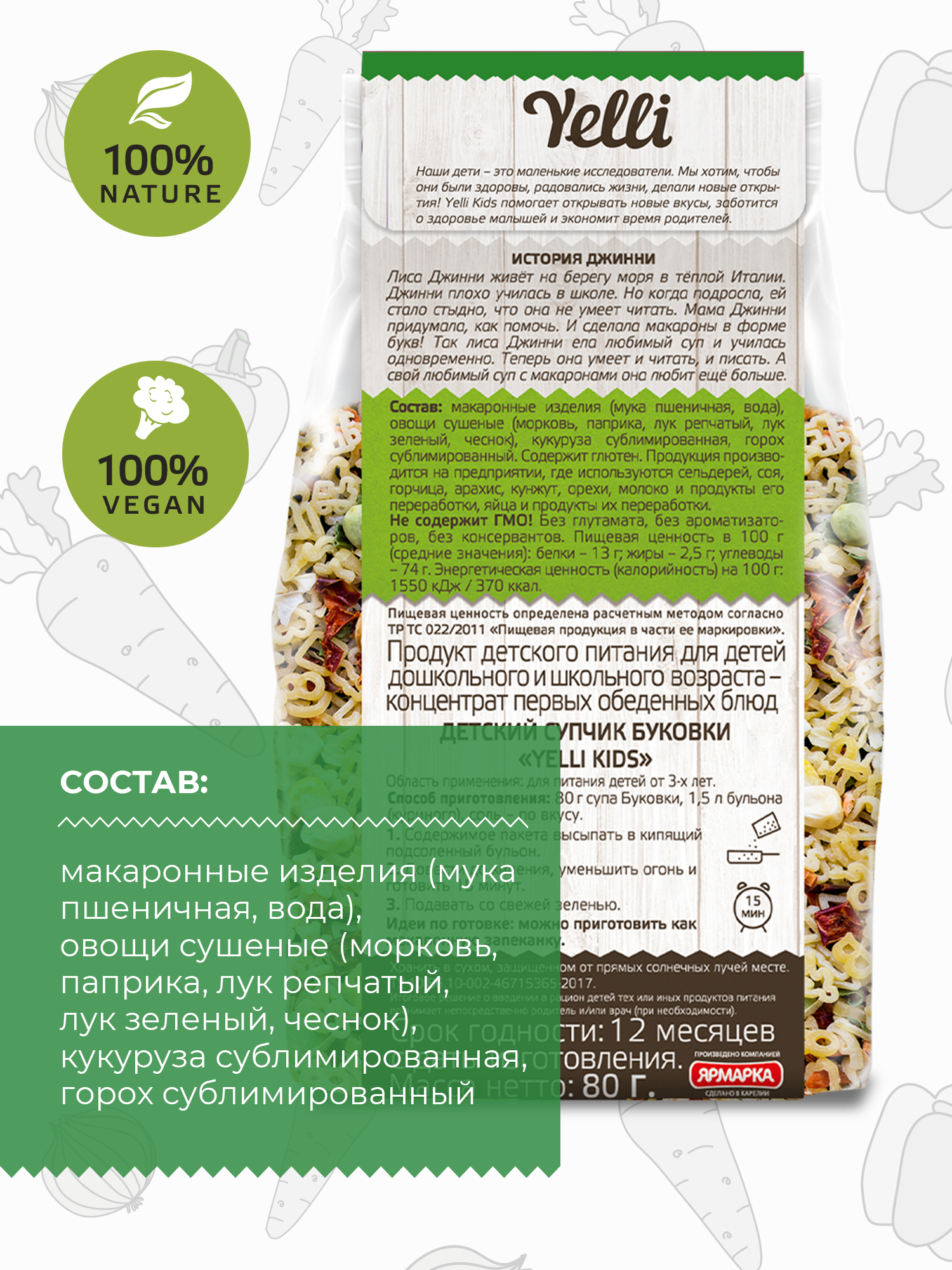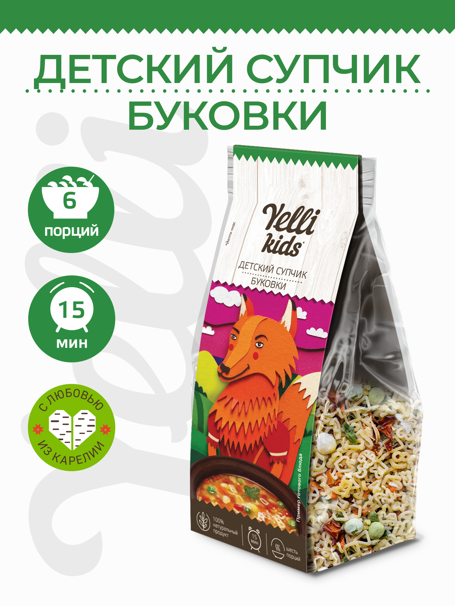 | Состав | Детский супчик Буковки Yelli kids 80г: макаронные изделия (мука пшеничная, вода), овощи сушеные (морковь, паприка, лук репчатый, лук зеленый, чеснок), кукуруза сублимированная, горох сублимированный. Детский супчик Гороховый Yelli kids 100г: хлопья гороховые, овощи сушеные (морковь, лук репчатый, лук зеленый, чеснок). |