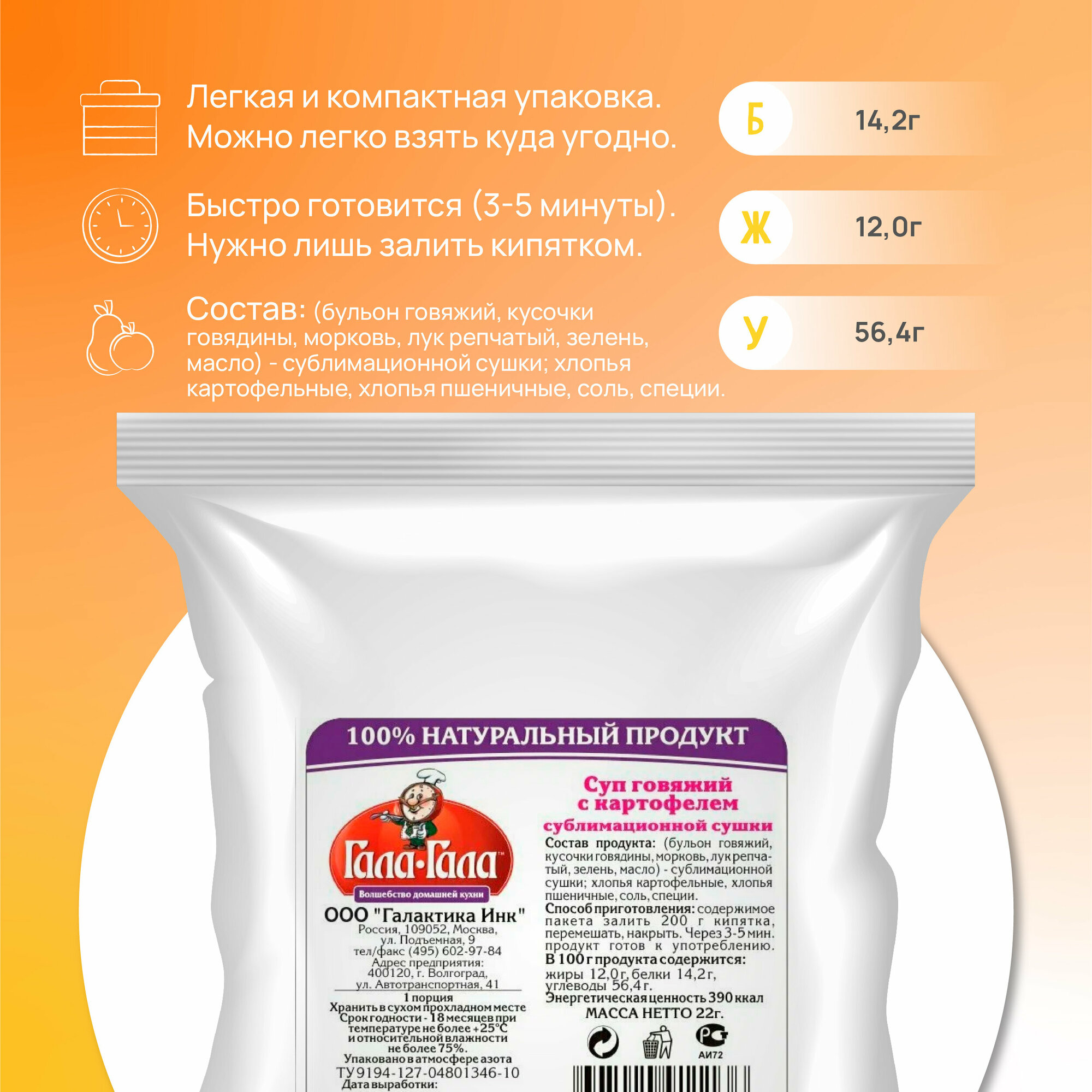 Суп говяжий с картофелем "Гала-Гала" 22 г/завтрак/обед/ужин/польза/витамины/вкусно/полезно/с собой/в поход/второе блюдо/перекус/мясо/картошка/бульон информация: