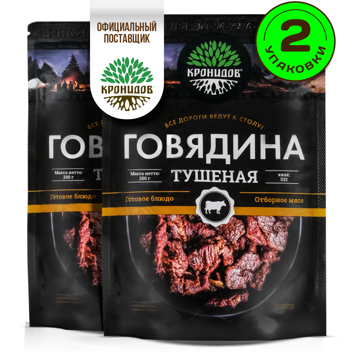 Готовое блюдо в реторт-пакете "Говядина тушеная высший сорт" Кронидов. Сухой паек для охоты, рыбалки, в поход. Набор 2 шт. по 250гр. информация: