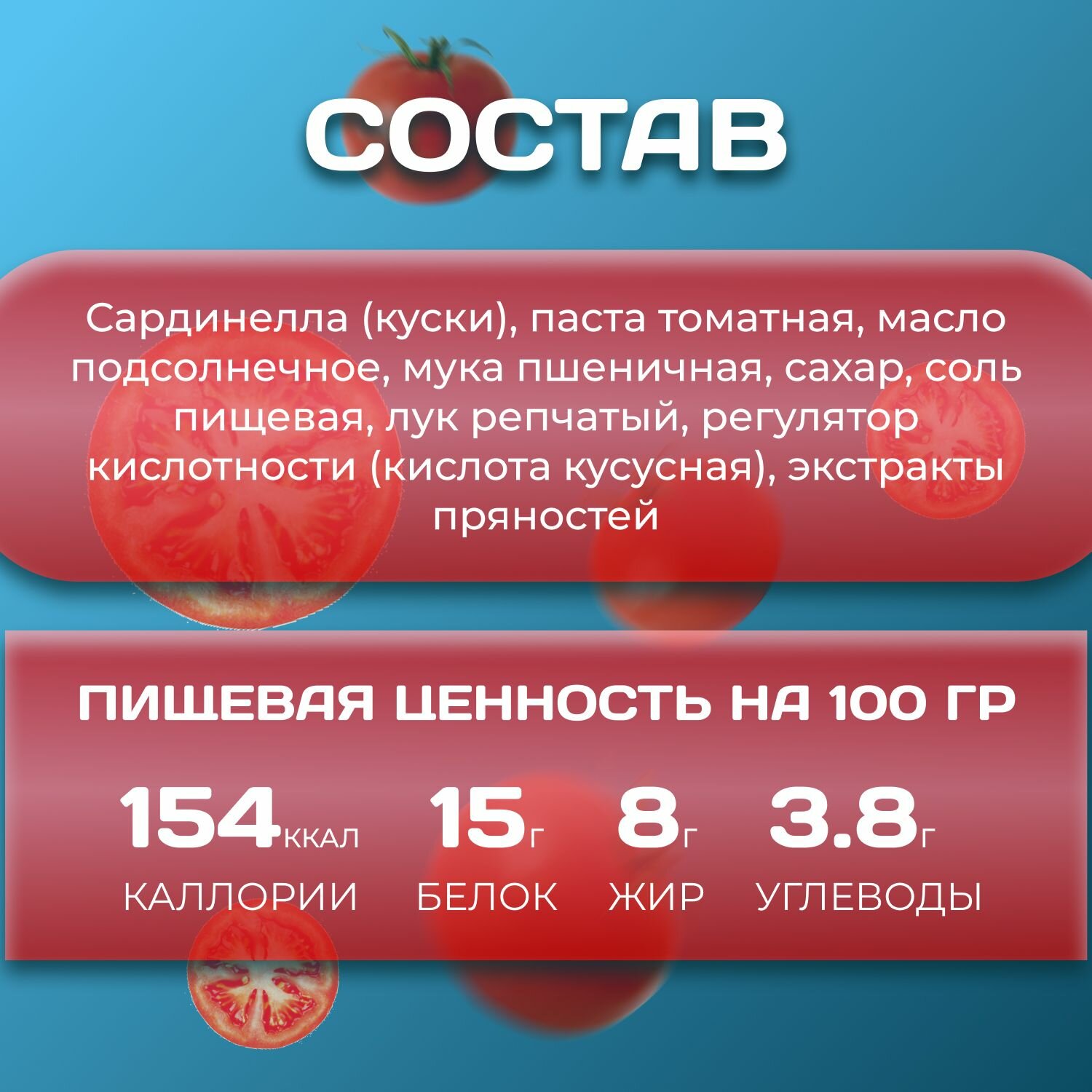 | Состав | Шпроты балтийская копченая, масло подсолнечное, соль пищевая, пищевая добавка жидкий дым "Суперсмок 130 Поли" |