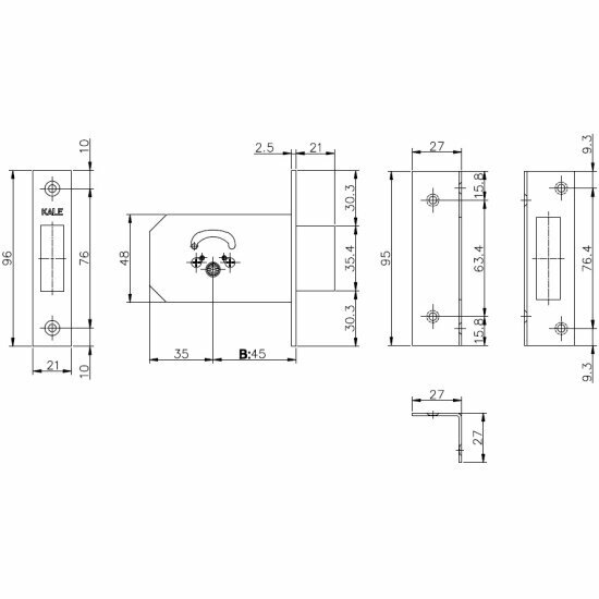 Замок врезной узкопрофильный Kale 201 с выпадающим язычком и цилиндровым механизмом в комплекте
