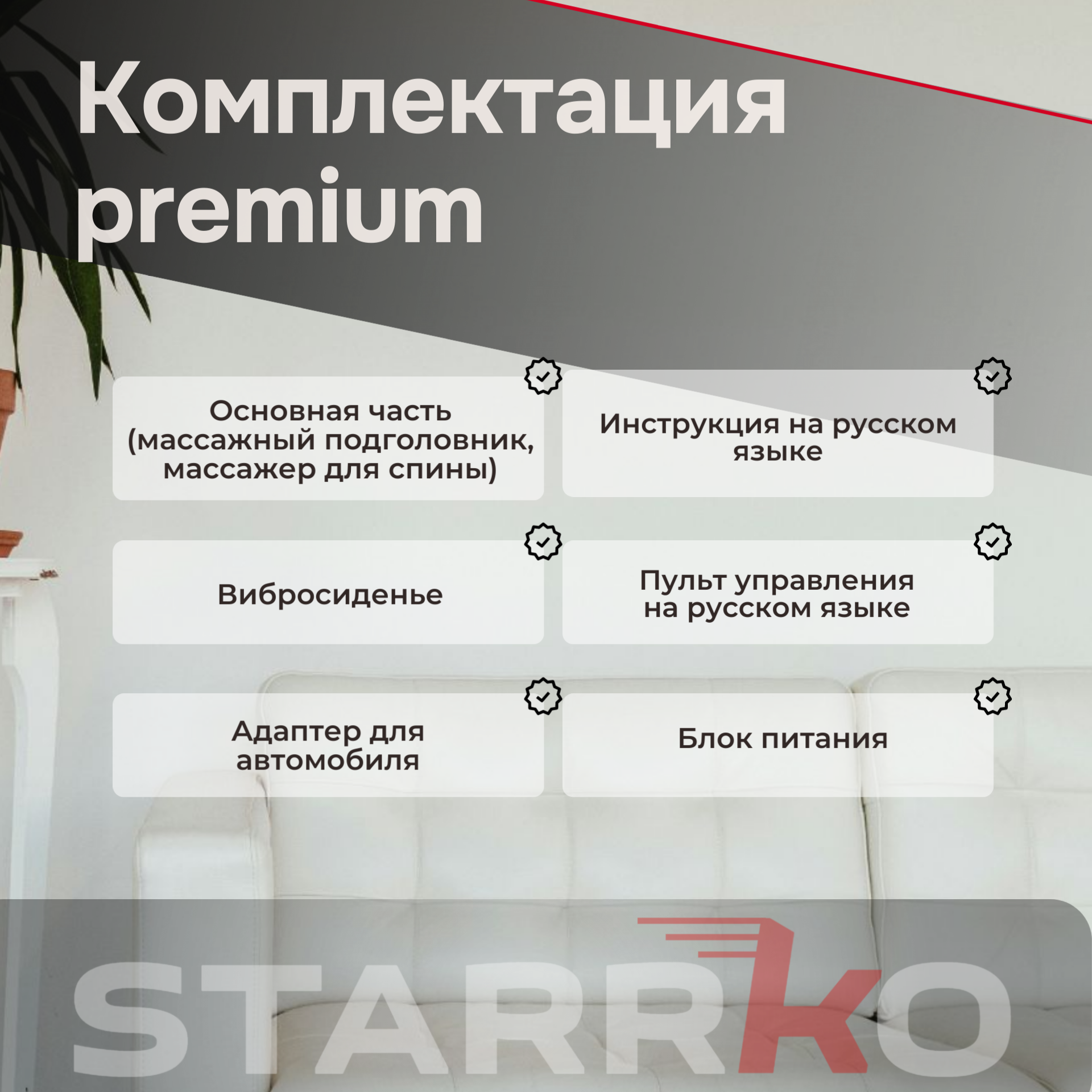 | Комплектация | подголовник массажер для шеи и плеч роликовый, массажная спинка роликовая с инфракрасным прогревом, массажная подушка вибрационная для ягодиц и бедер, пульт управления на русском языке, инструкция на русском языке, адаптер для использования в автомобиле |