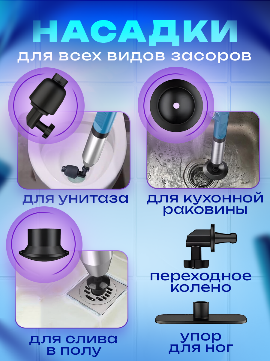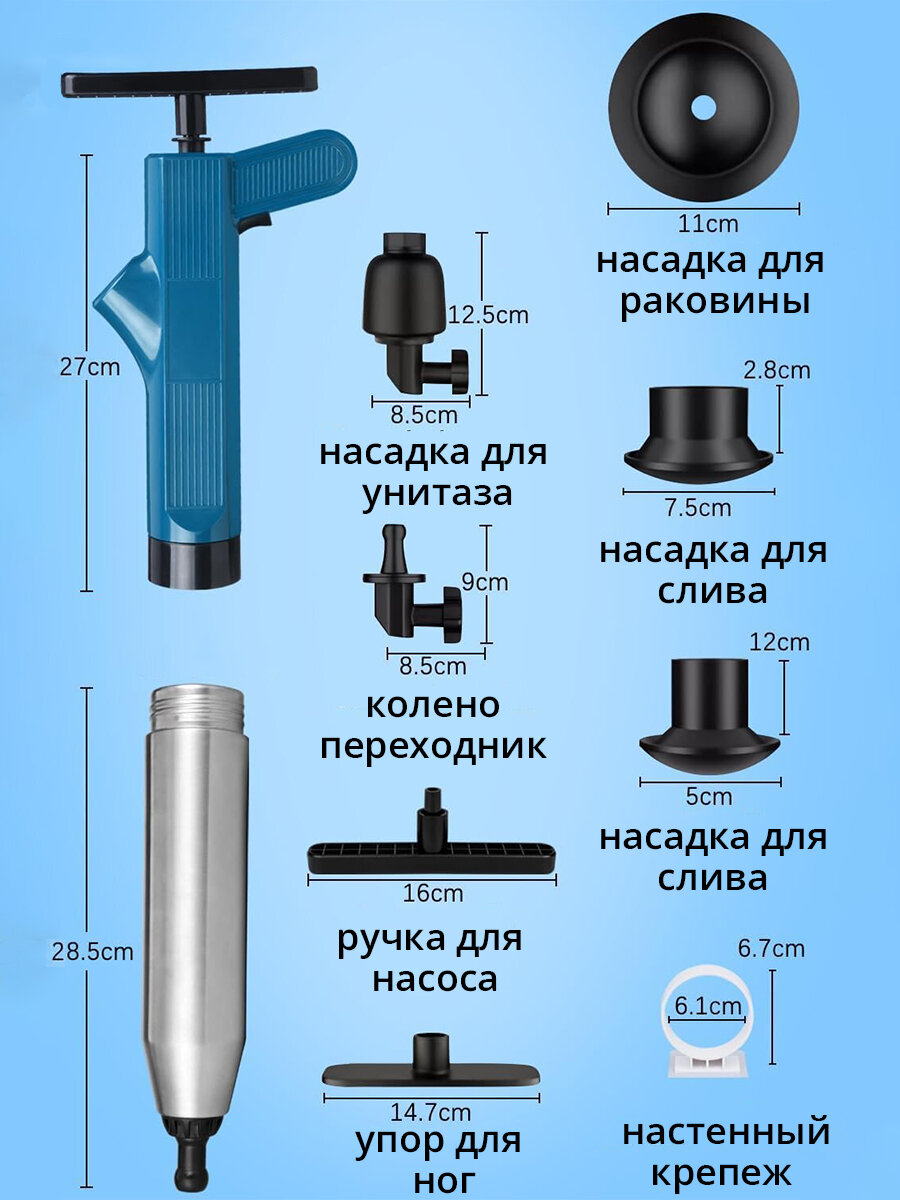 | Комплектация | Пневмовантуз - 1шт; насадка для унитаза - 1шт; колено-переходник - 1шт; насадка для раковины - 1шт; насадки для сливных отверстий - 2шт; ручка для накачивания - 1шт; упор для ног - 1шт; настенный держатель - 1 шт.; инструкция-1шт |