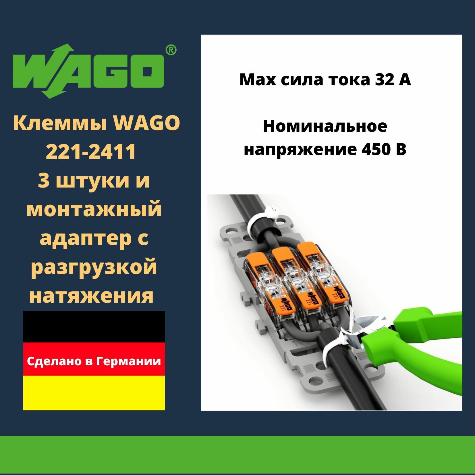 Комплект клеммы WAGO 221-2411 compact 3 шт. + монтажный адаптер с разгрузкой натяжения 221-2503 3-кан. информация: