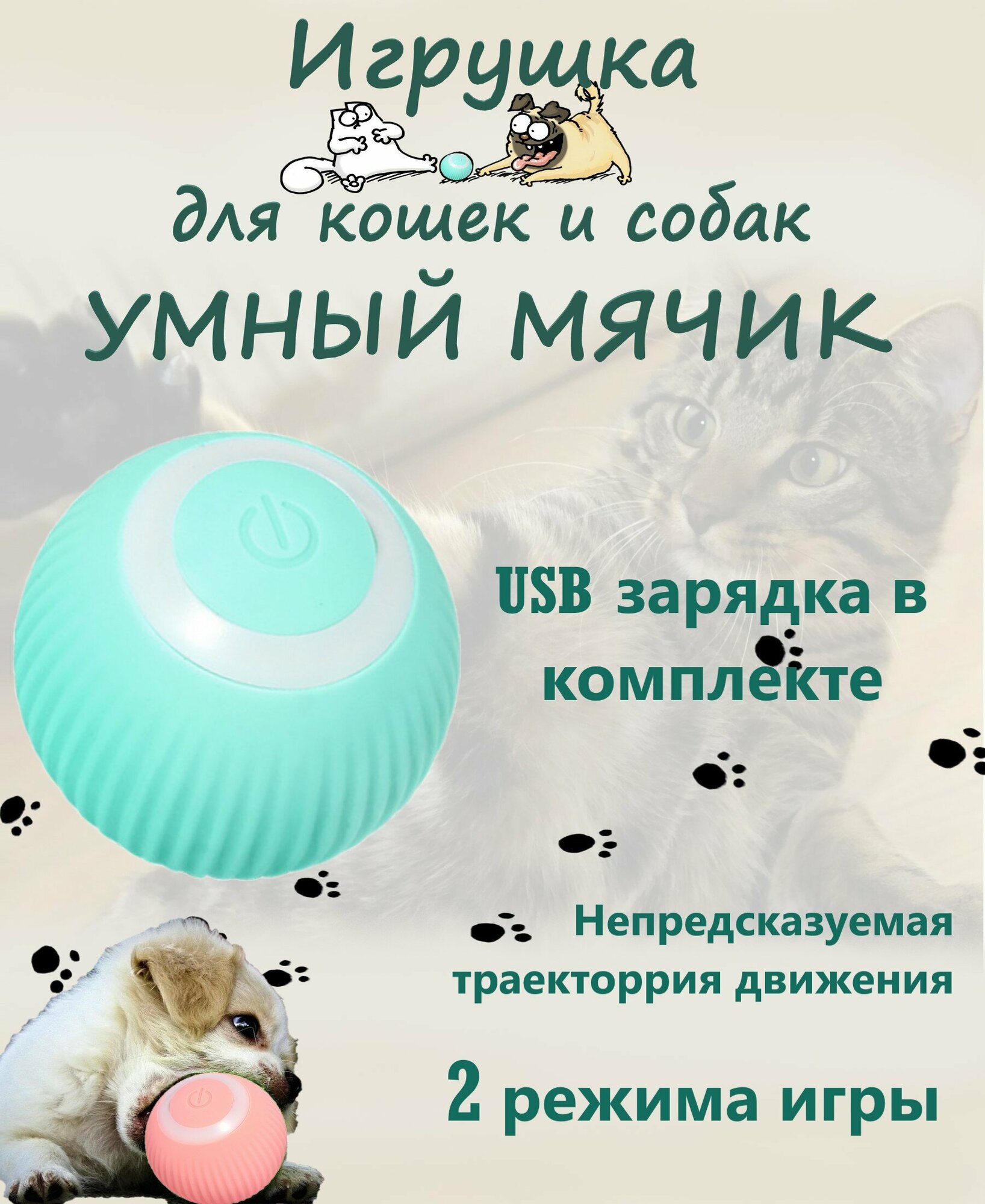 Интерактивная игрушка для кошек и собак, умный мячик цвет голубой информация: