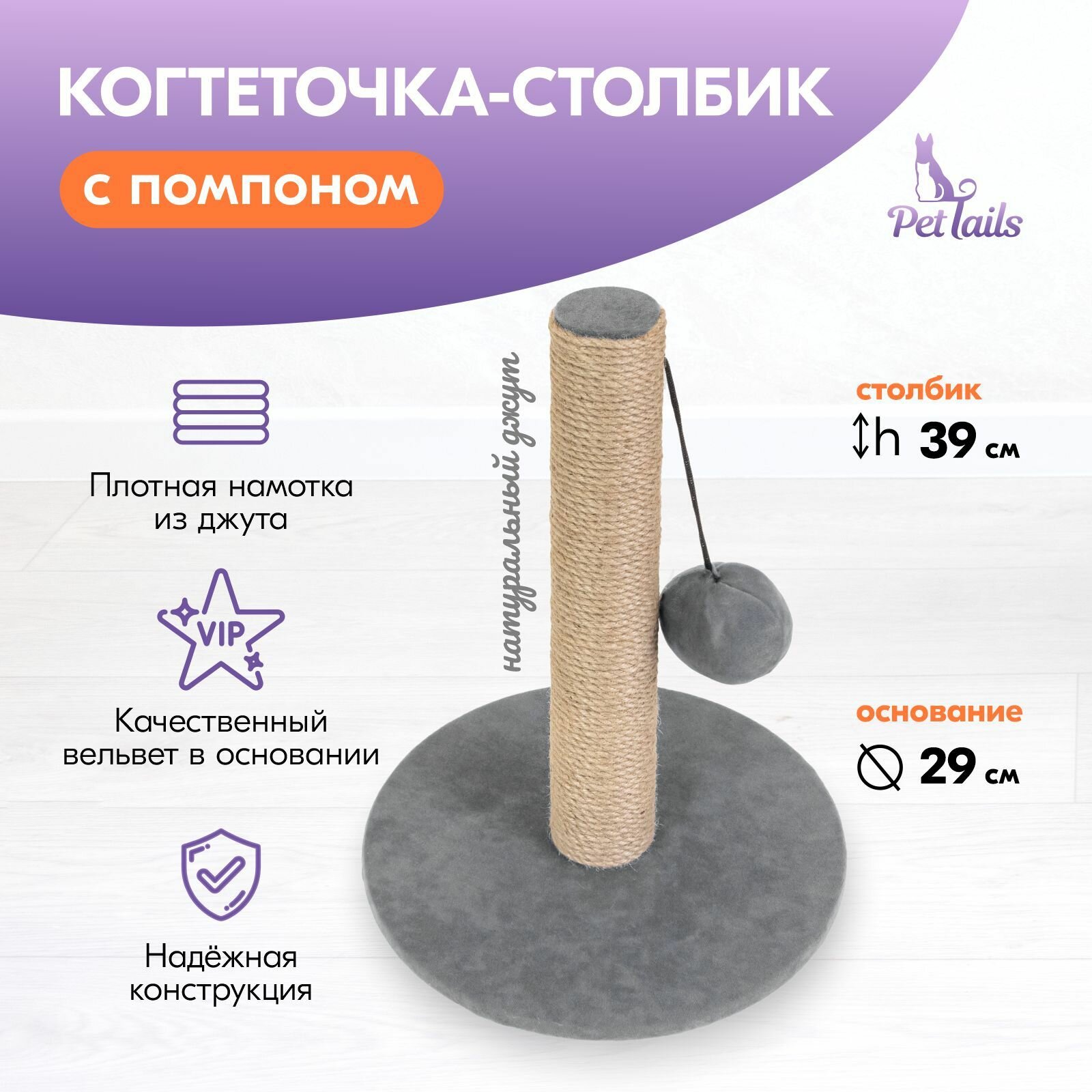 Отзывы на Когтеточка-столбик вельвет "PetTails" круглая с помпоном 29*h39см (джут, ткань вельвет) серая