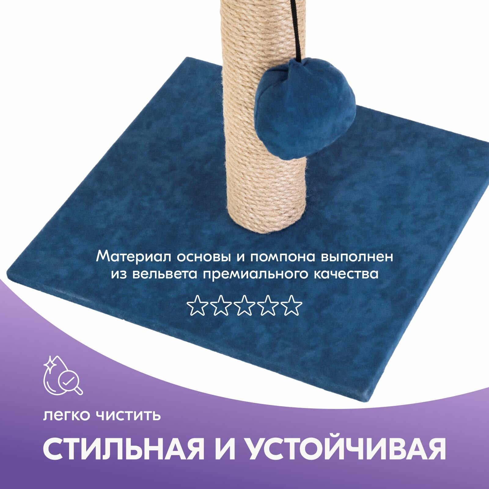 Отзывы на Когтеточка-столбик вельвет "PetTails" квадратная с помпоном 30х30хh39см (джут, ткань вельвет) синяя