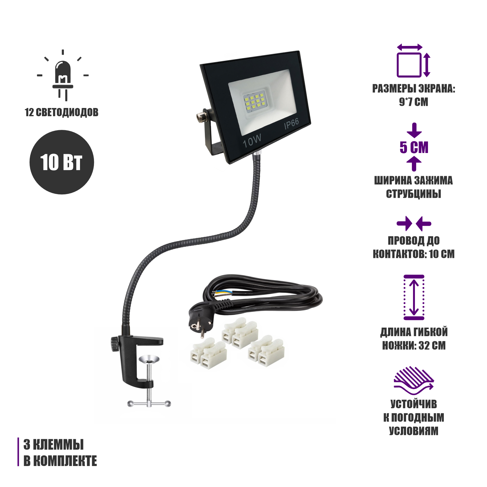 10 цен на Переносной светильник 10Вт на гибком креплении и усиленной струбцине GDSUS-38 с кабелем 1,5 м и клеммами