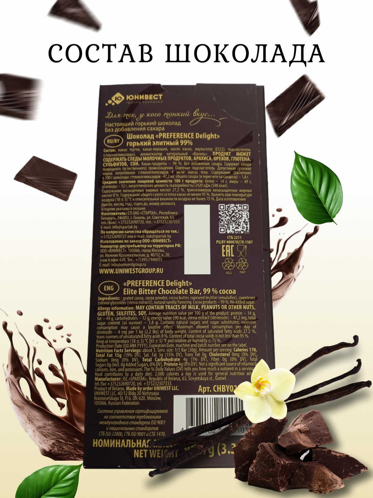 Шоколад горький без сахара 99% PREFERENCE Delight тонкий 4 шт по 95г информация: