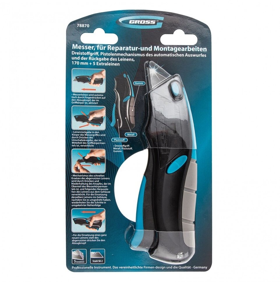 10 цен на Нож пистолетный Gross, трапециевидный, трехкомпонентный корпус, 5 сменных лезвий, 19 мм