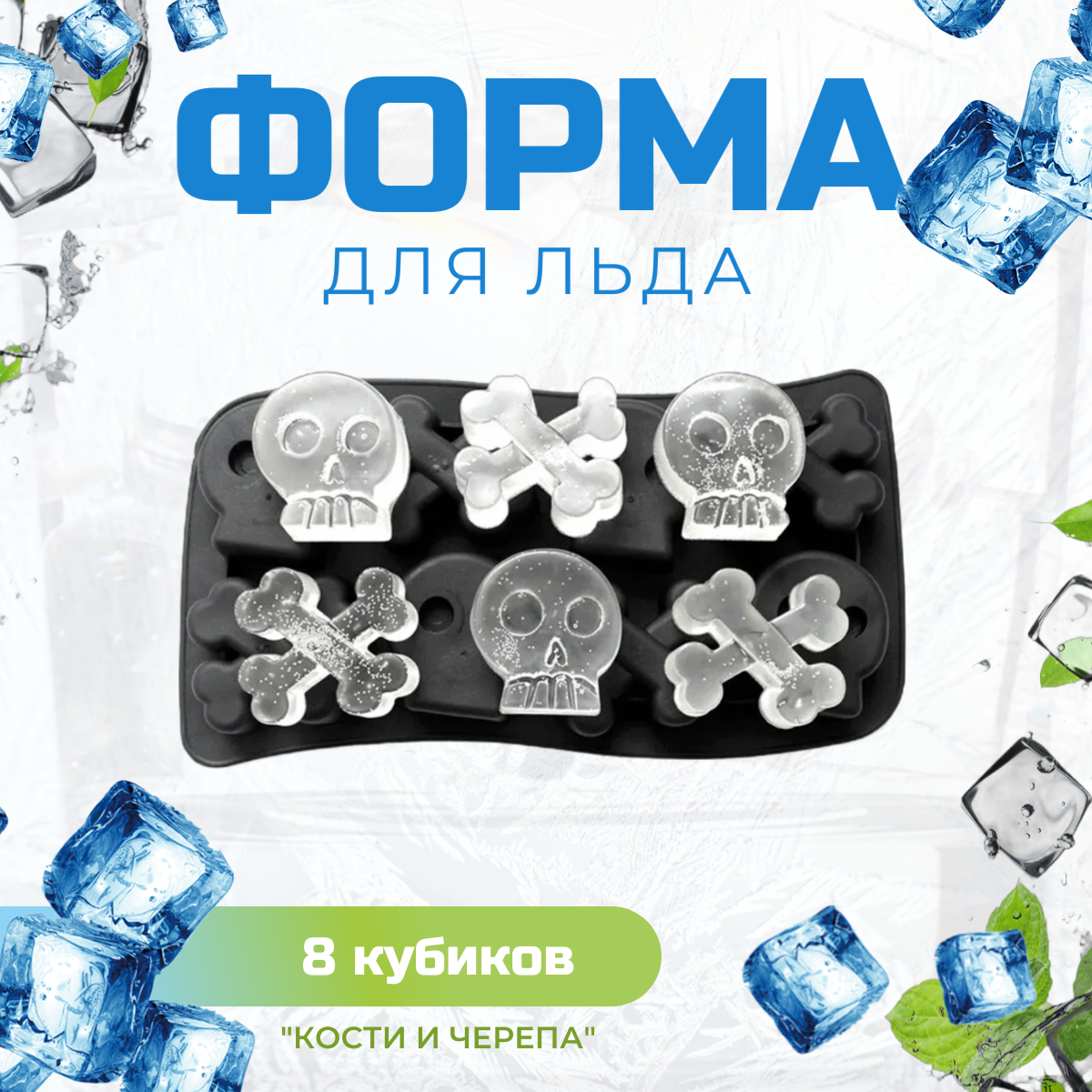 Форма для льда / шоколада / Формочка для конфет "Кости и черепа" (8 кубиков) (Чёрная) информация: