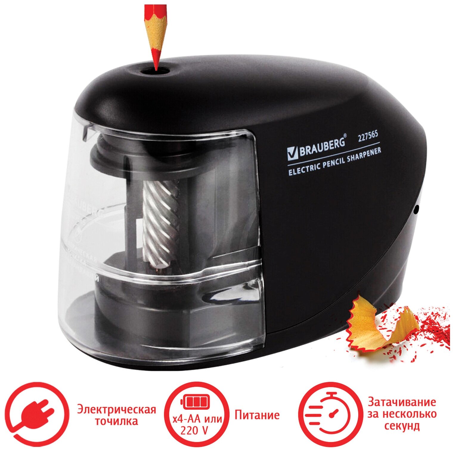 Точилка электрическая (электроточилка) для карандашей с контейнером для стружки, питание от сети 220В/4 батарейки АА, надежный фрезерный механизм, Brauberg