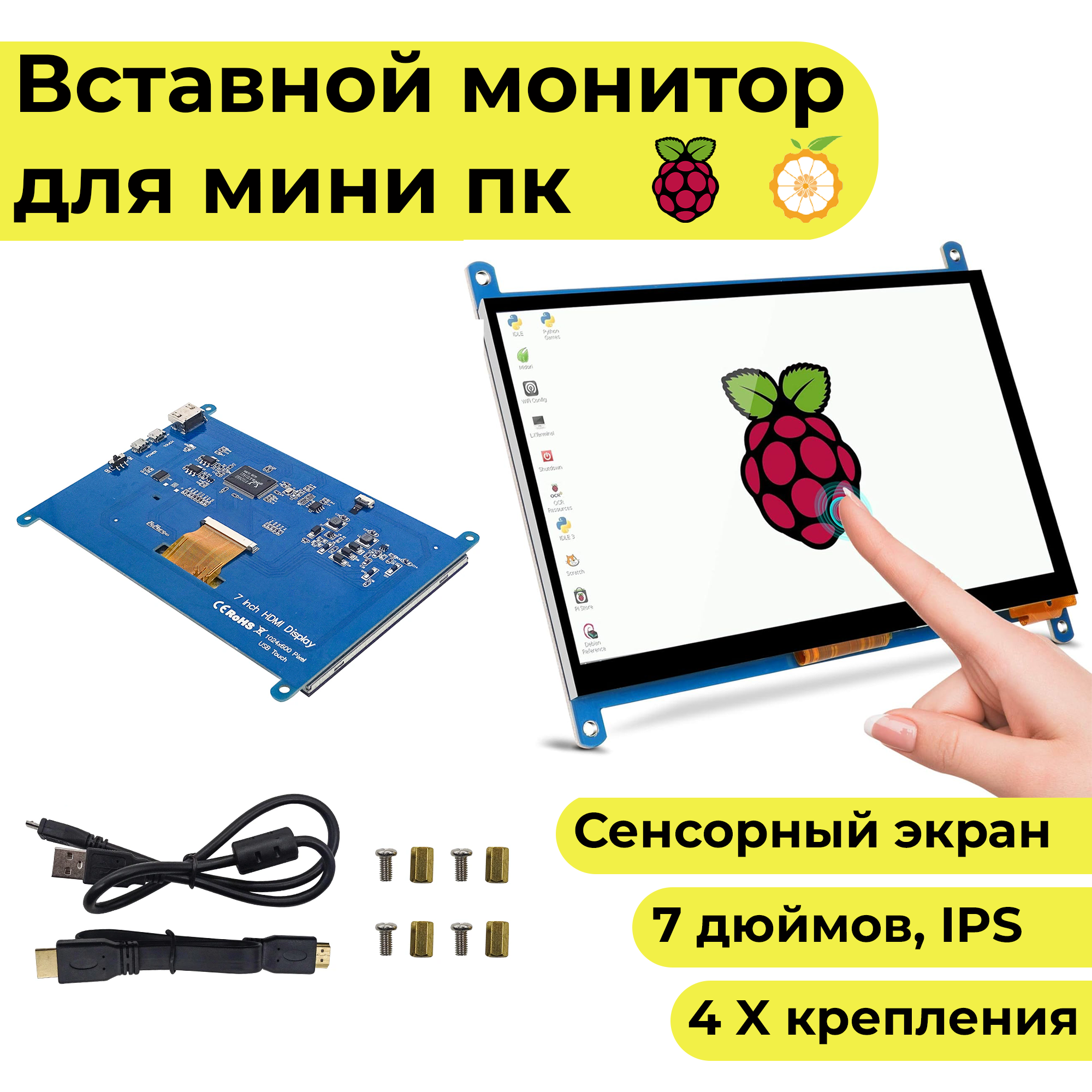 Вставной 7-дюймовый сенсорный экран-монитор-дисплей для микрокомпьютера (Orange и Raspberry PI, IPS) информация: