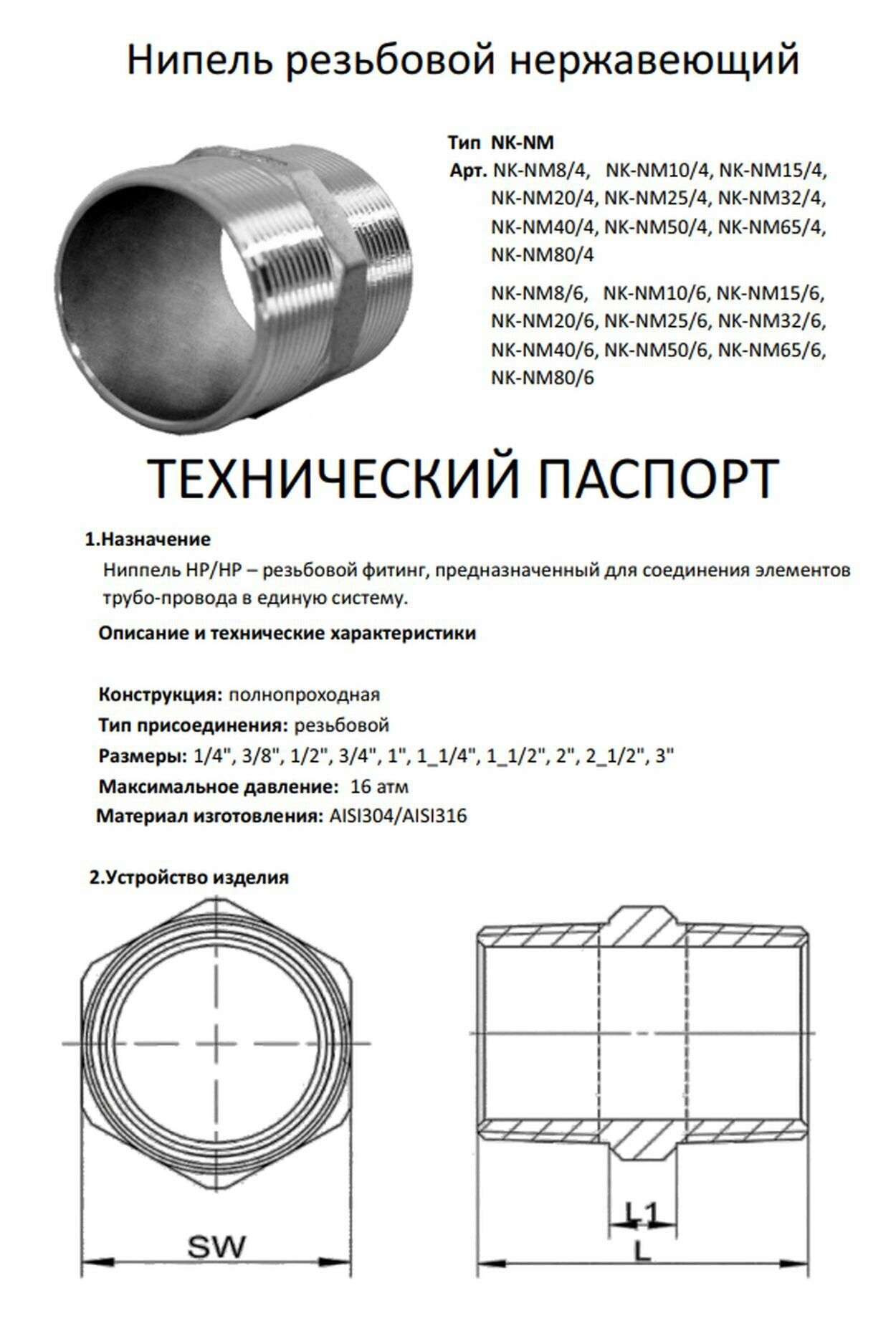 Ниппель резьбовой нержавеющий, AISI304 DN 8 (1/4"), (CF8), PN16 информация: