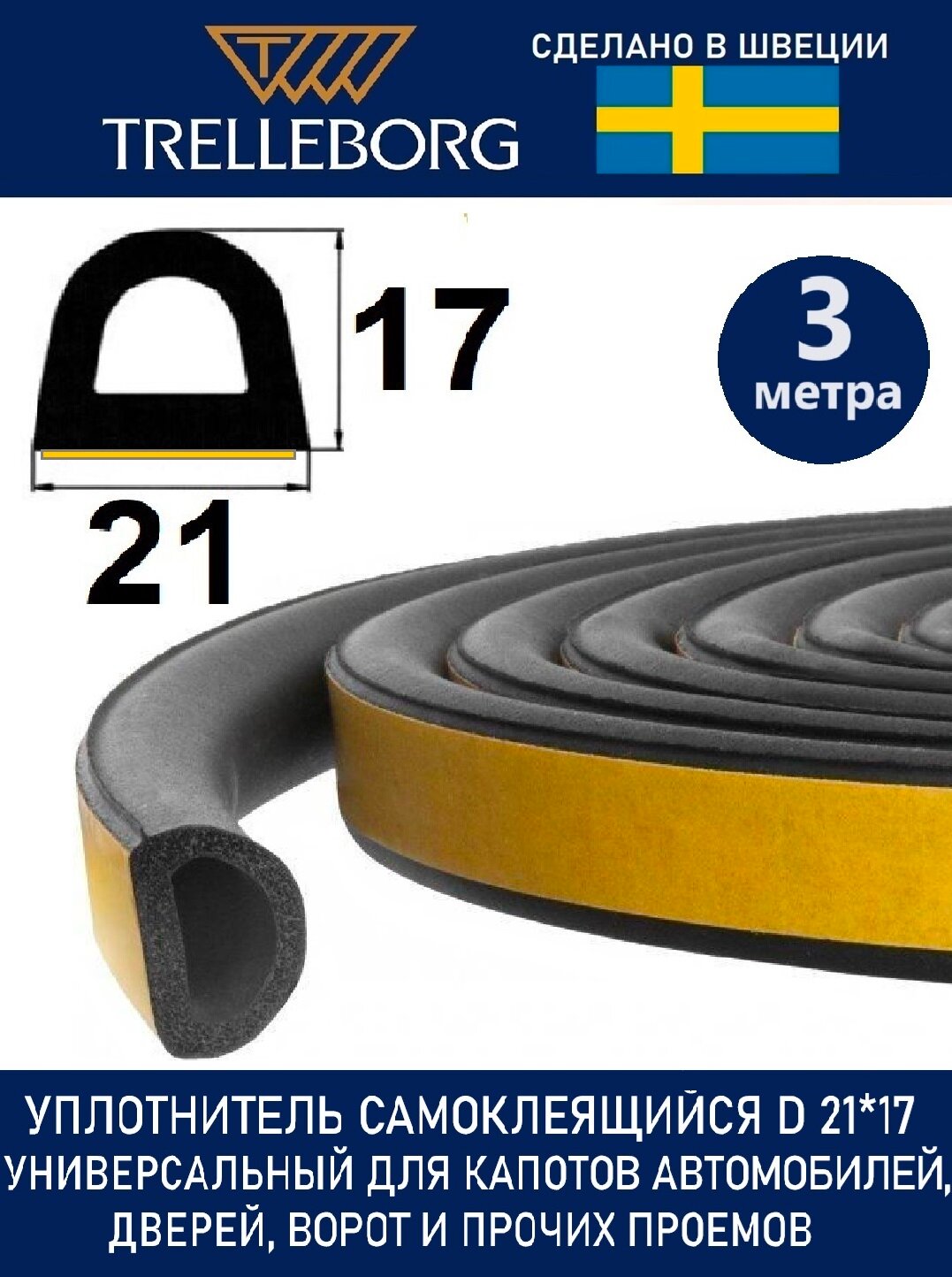 Уплотнитель самоклеящийся Trelleborg (Швеция) универсальный D-профиль 21*17 мм, черный, 3 метра /Дверной/Для капота