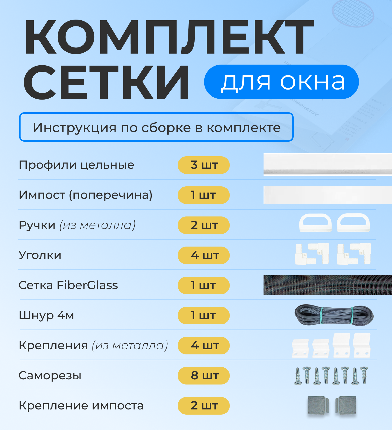 | Дополнительная информация | в комплекте: профиль алюминиевый рамный 1,2 м. - 3 шт. импост (поперечина) - 0,6 м уголок пластиковый соединительный - 4 шт. полотно москитной сетки 1,4х0,75 м.- 1 шт. ручки для сетки пластиковые- 2 шт. шнур фиксирующий 4 м - 1 шт. крепления для импоста - 2 шт. крепление для москитной сетки нижнее (короткое)- 2 шт. крепление для москитной сетки верхнее (длинное)- 2 шт. саморез с буром для креплений- 8 шт. |