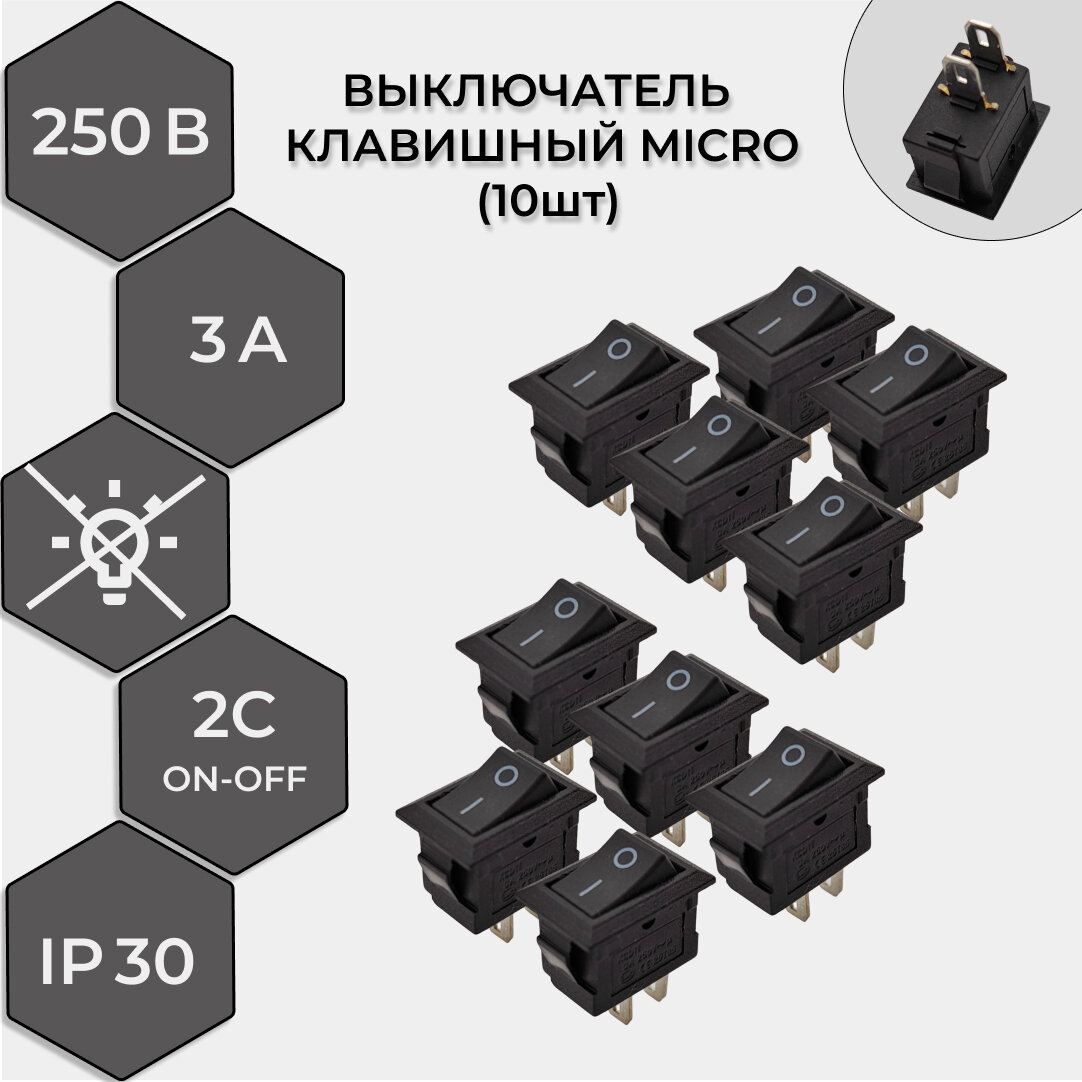 10 цен на Выключатель клавишный 250В 3А (2с) ON-OFF Micro черный Rexant (10шт)