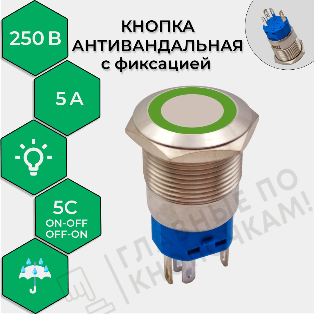 Кнопка антивандальная Ø19 250В Фикс (5с) ON-OFF/OFF-ON подсв/зеленая REXANT информация: