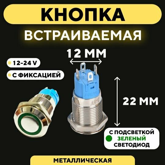 10 цен на Кнопка встраиваемая в корпус металлическая с индикатором (12-24 В, 12 мм) / Зеленый / С фиксацией. Круг