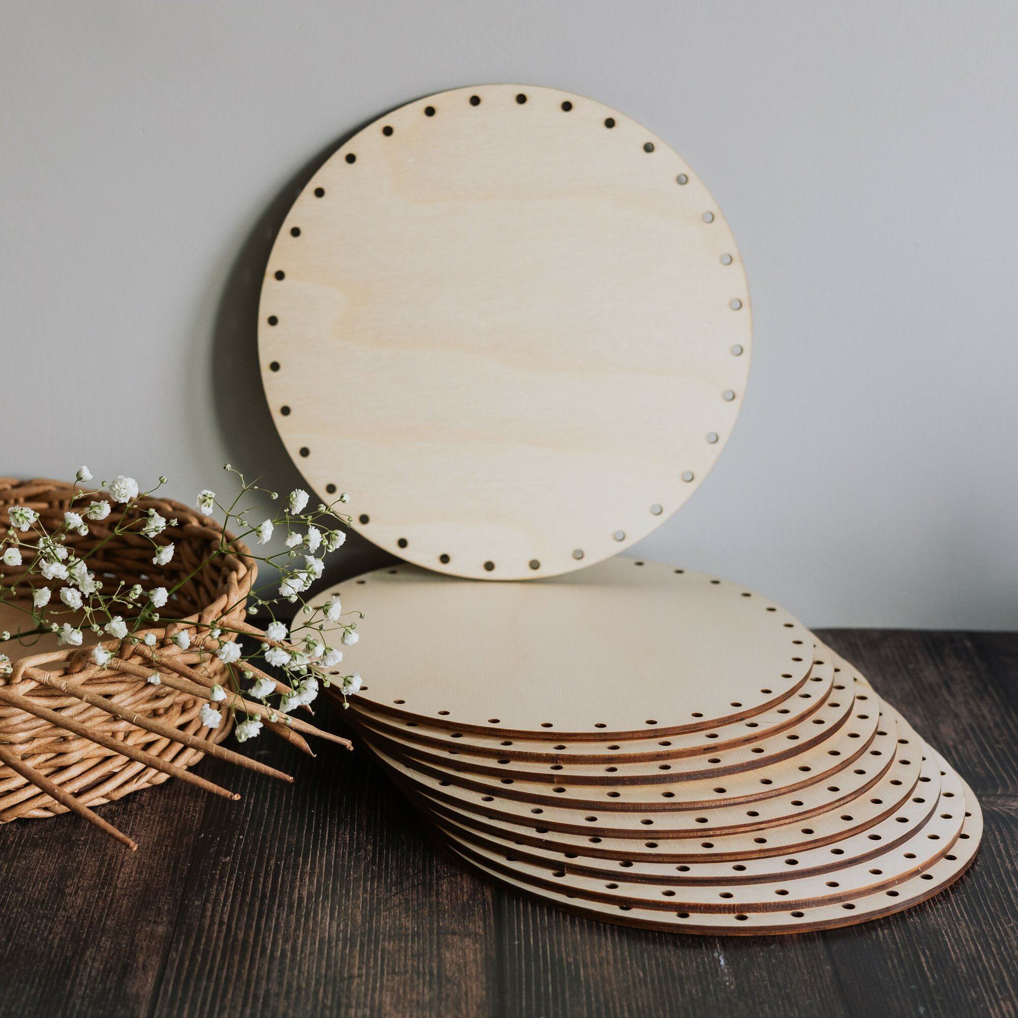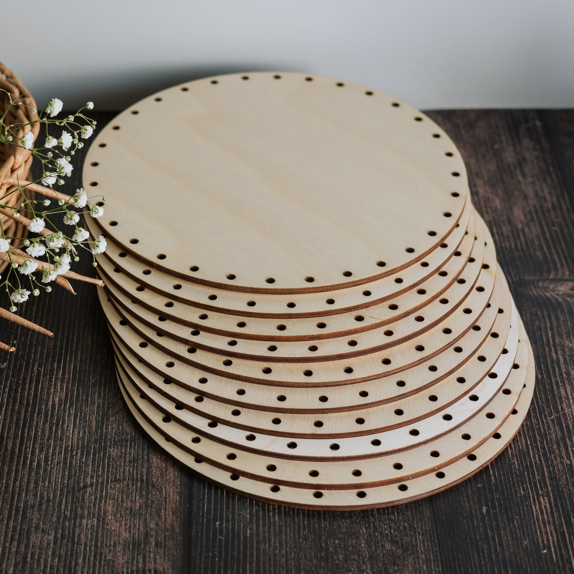 ⌀ 20см 10шт отверстия ⌀4мм. Донышки круглые для плетения корзин из бумажной лозы толщина 4мм информация: