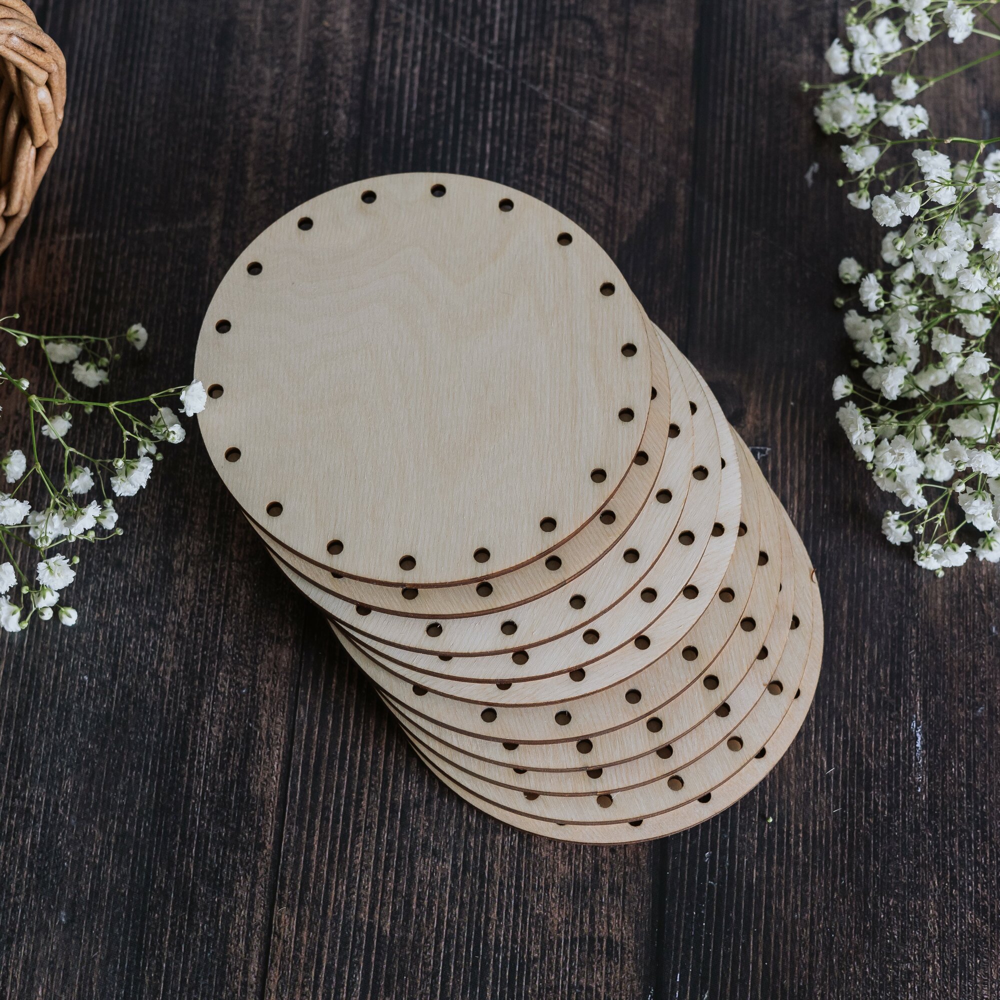 ⌀ 20см 10шт отверстия ⌀4мм. Донышки круглые для плетения корзин из бумажной лозы толщина 4мм 579 ₽