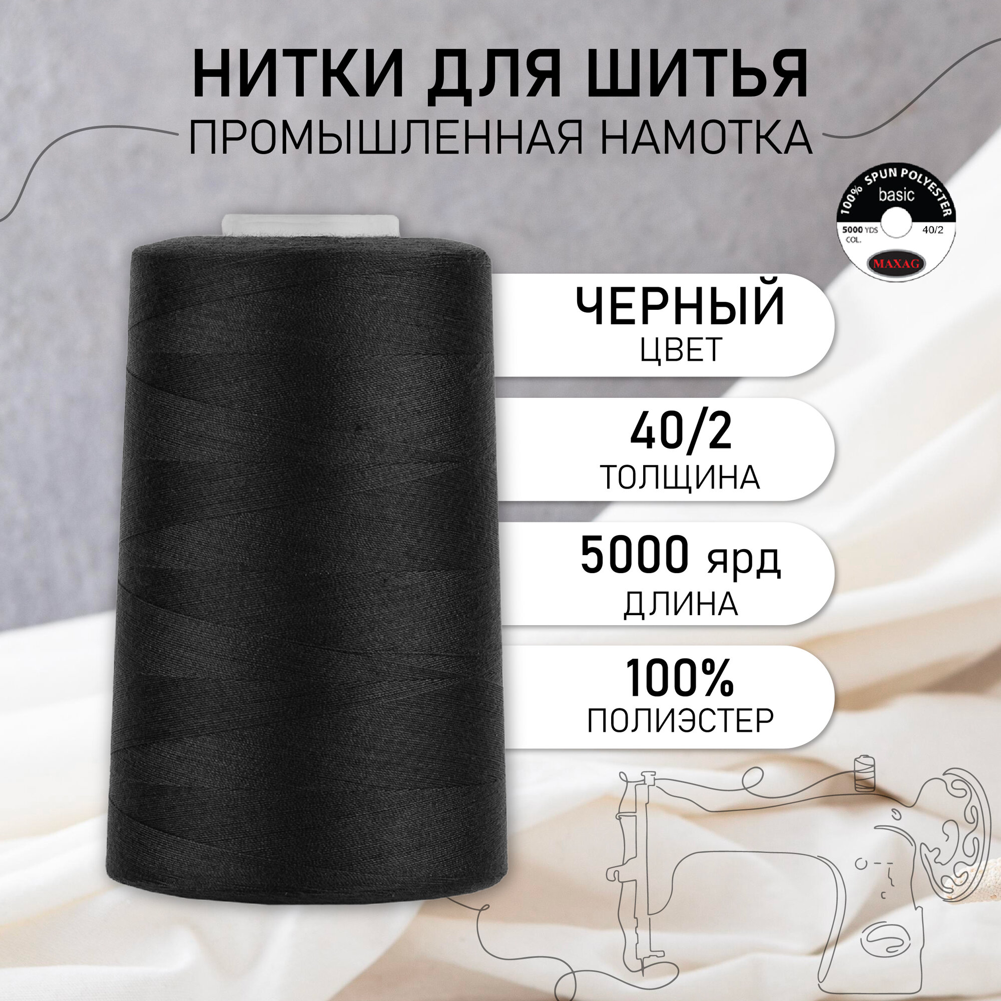 Нитки MAXag basic 40/2, 5000 ярдов, цвет черный, 100% полиэстер Max (2.40/2.MAX.черный) информация: