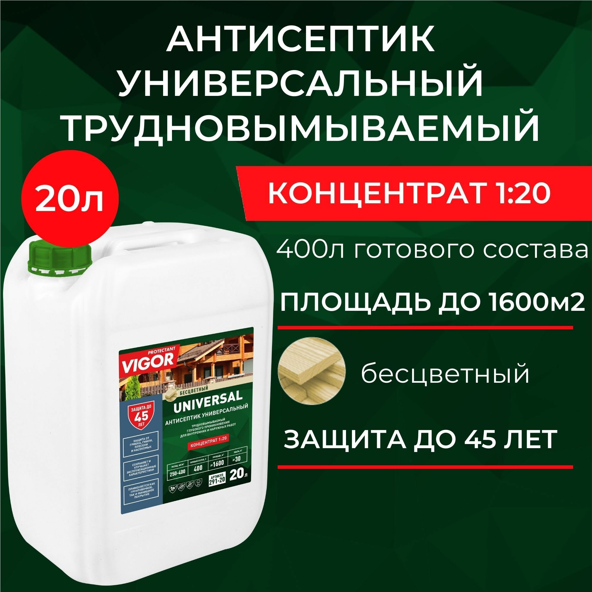 10 цен на Концентрат 1:20. Антисептик для дерева трудновымываемый PROTECTANT VIGOR UNIVERSAL 20л.