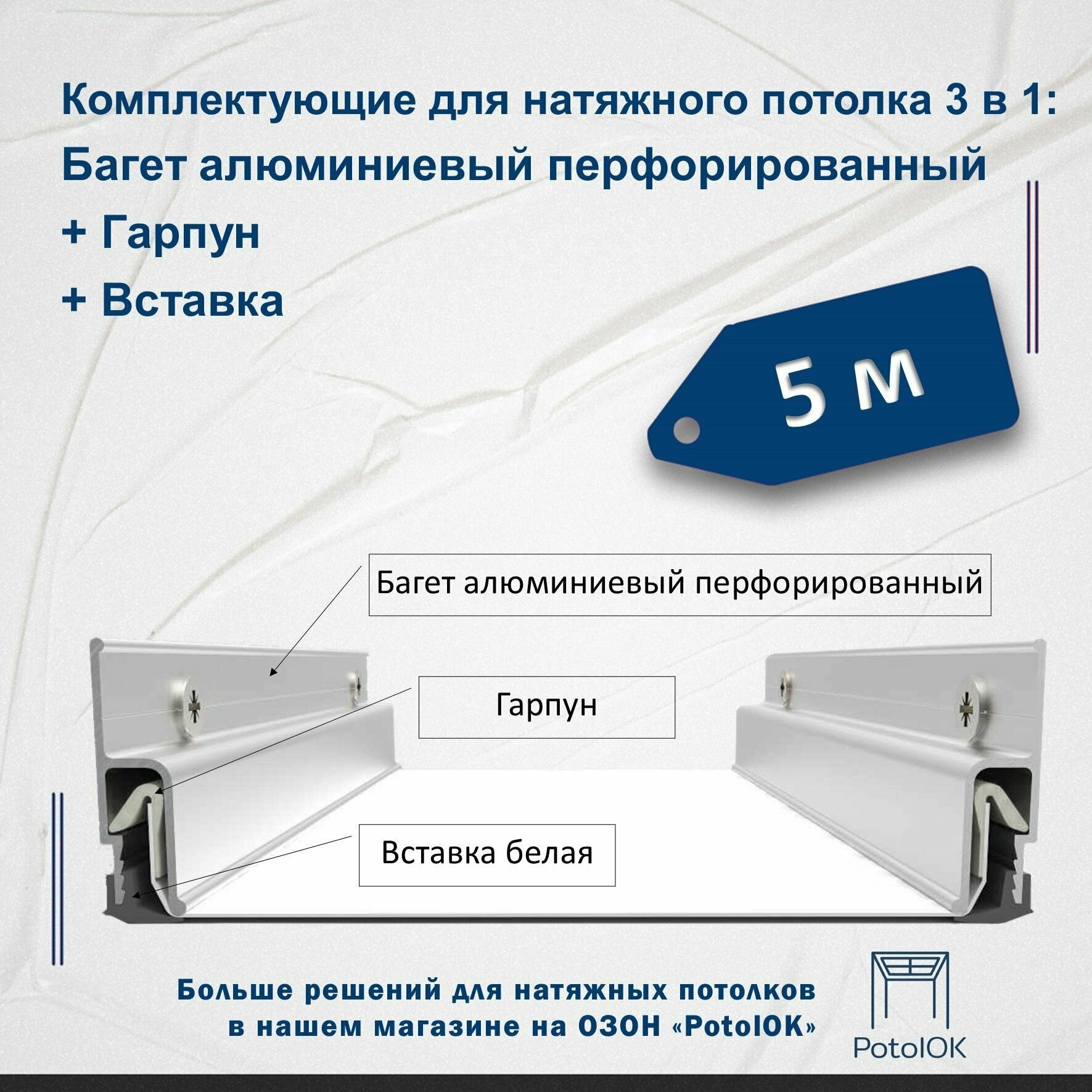 Комплектующие для натяжного потолка 3 в 1: Багет алюминиевый перфорированный + Гарпун + Вставка - по 5 м информация: