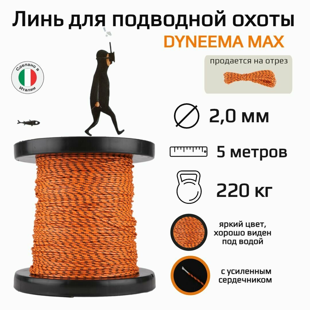 Линь для подводной охоты Dyneema Max, 2.0 мм диаметр, нагрузка 220 кг, оранжевый 5 м информация: