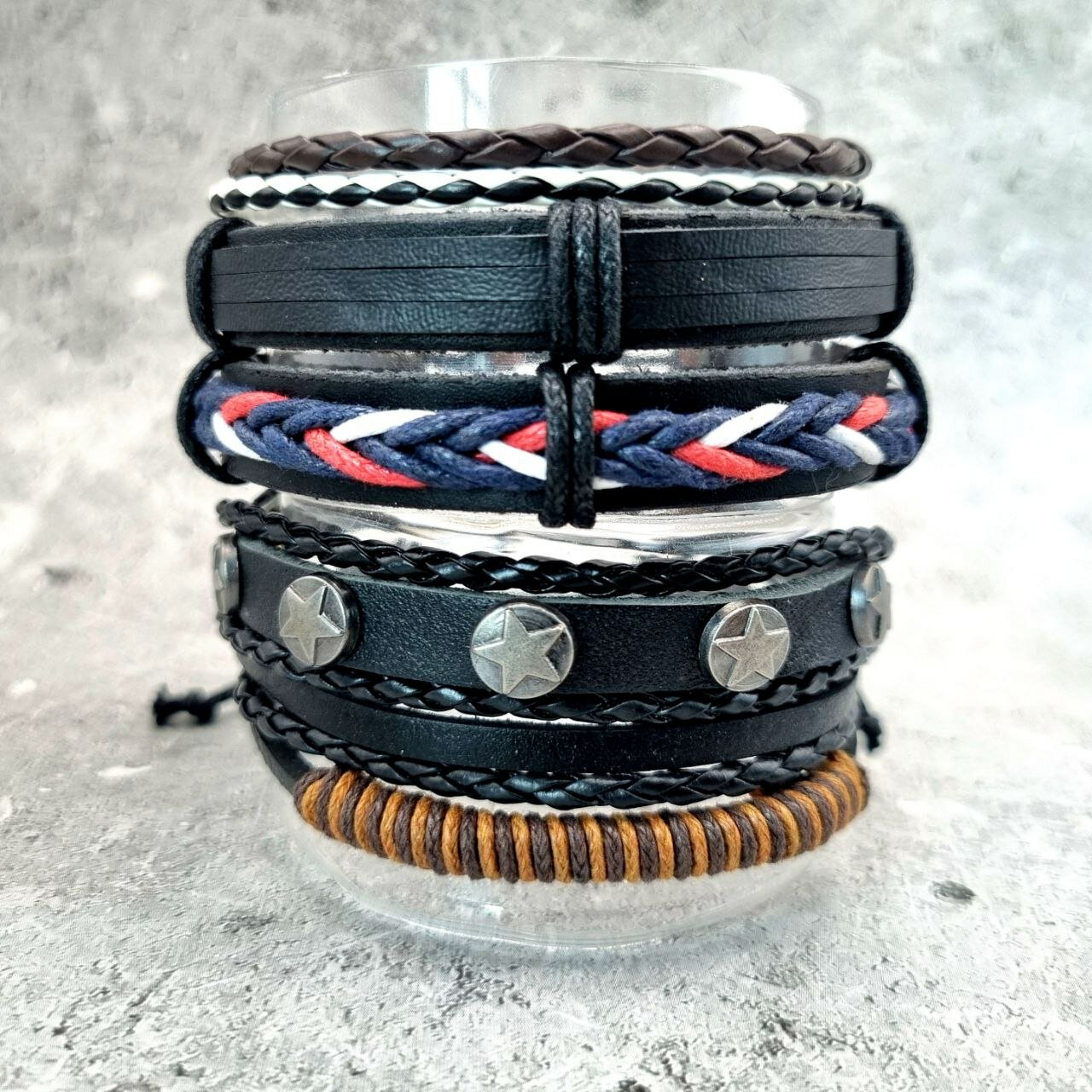 | Дополнительная информация | Браслет на завязках безразмерный, кожаный, бижутерия, украшение на руку, комплект\набор 5 в 1 |