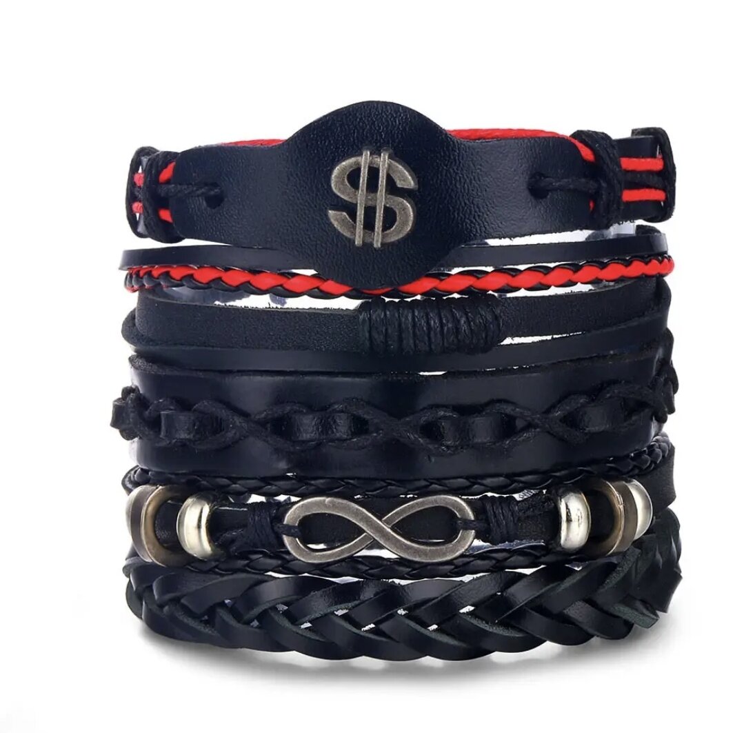 Отзывы на Браслет на руку на завязках 5 в 1 плетеный, знак доллара, бесконечность, косички, унисекс, мужской/женский/для подростков, сплав+экокожа, 5 в 1, черный/красный