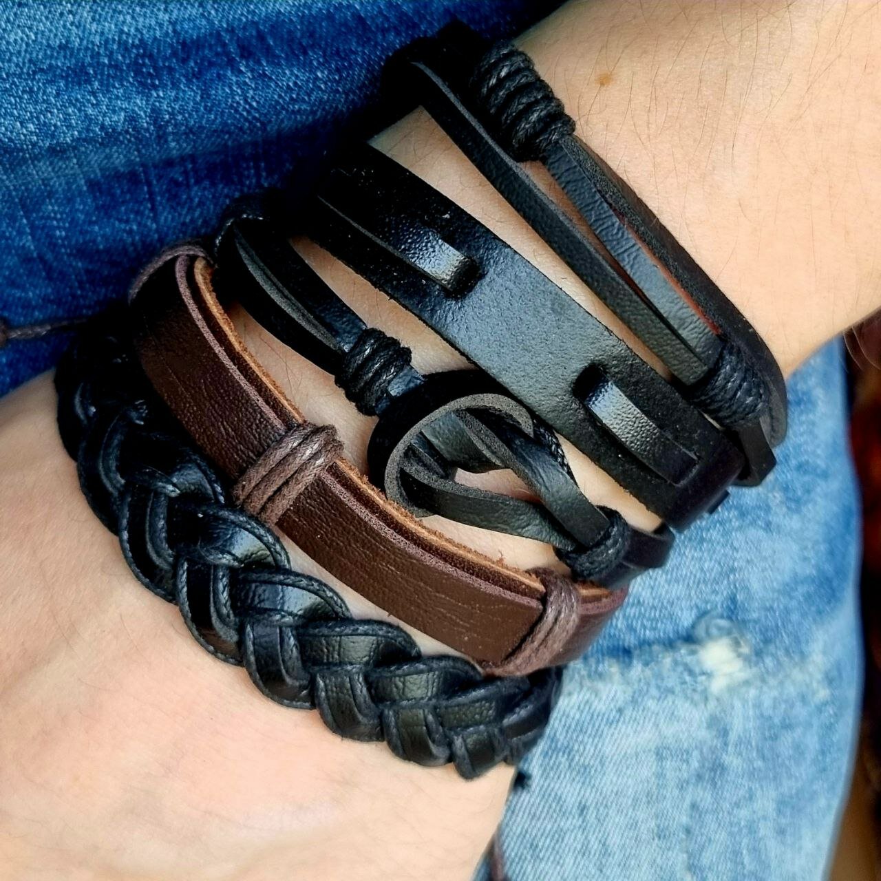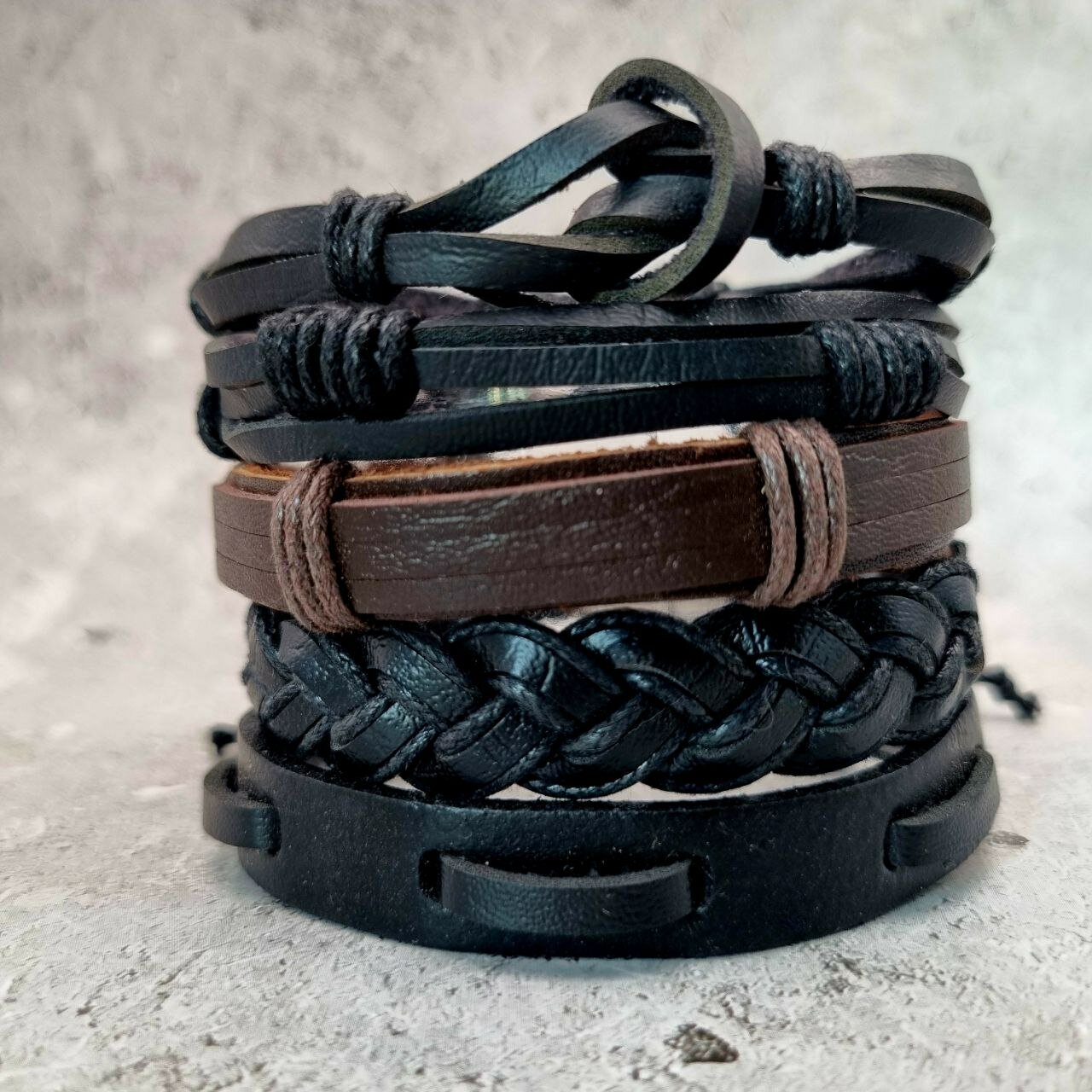 | Дополнительная информация | Браслет на завязках безразмерный, кожаный, бижутерия, украшение на руку, комплект\набор 5 в 1 |