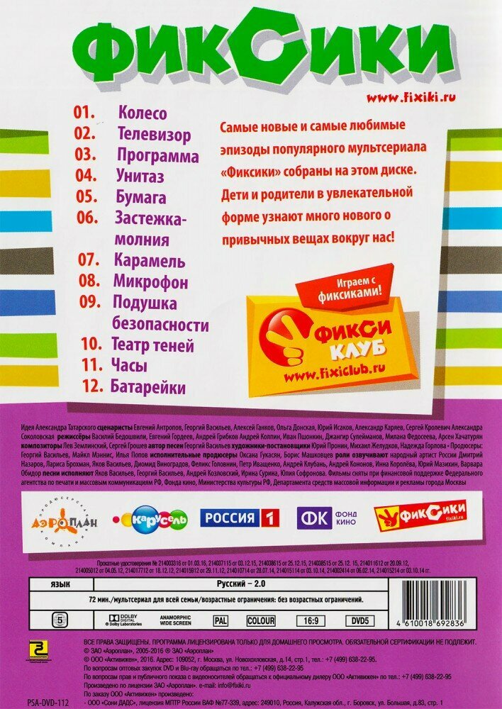 | Аннотация | Самые новые и самые любимые эпизоды популярного мультсериала "Фиксики" собраны на этом диске. Дети и родители в увлекательной форме узнают много о привычных вещах вокруг нас!; Содержание:; 1.Колесо; 2.Телевизор; 3.Программа; 4.Унитаз; 5.Бумага; 6.Застежка-молния; 7.Карамель; 8.Микрофон; 9.Подушка безопасности; 10.Театр теней; 11.Часы; 12.Батарейки |