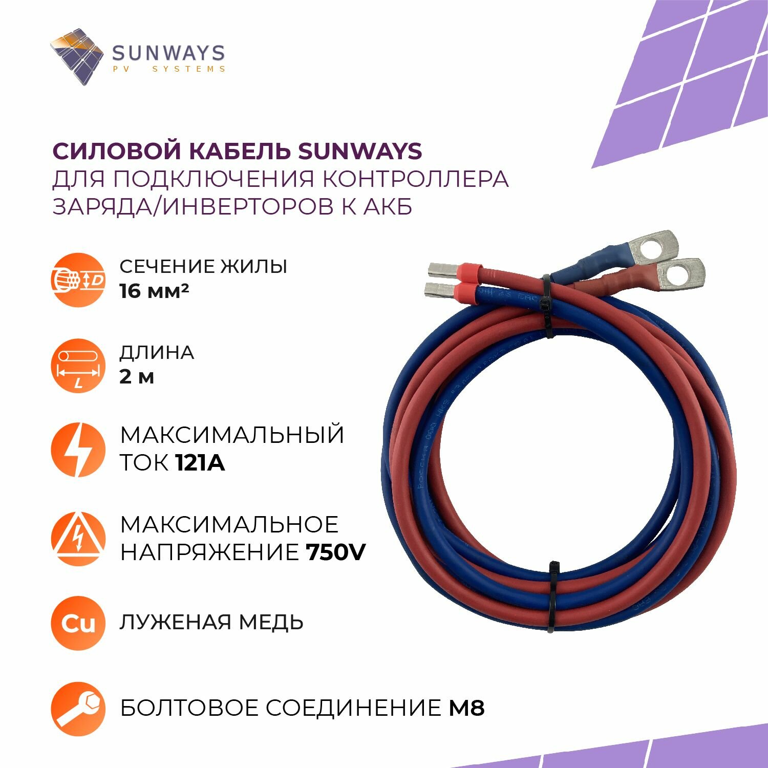 Силовой кабель для подключения контроллера заряда/инверторов к АКБ, 16 мм2, 2 м, Sunways, 1 шт информация: