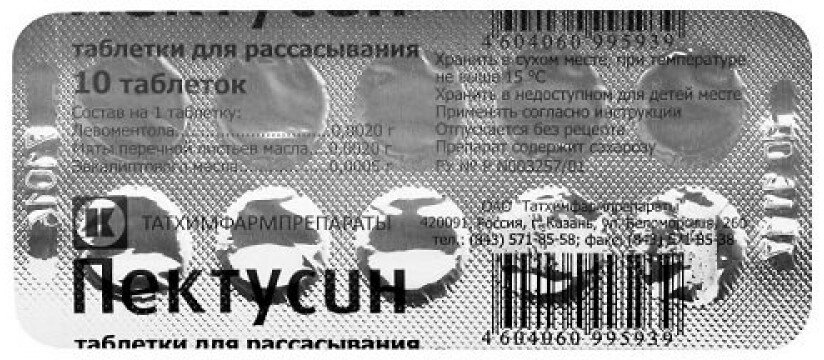 | Состав | 1 таблетка содержит:Активные вещества, левоментола - 0.0020 г.мяты перечной листьев масла в пересчете на 100 % левоментол - 0,0020 г, эвкалиптового масла - 0,0005 г.Вспомогательные вещества', сахарозы (сахар-рафинад) - 0.7571 г, кармеллоза натрия -0,0120 г, кремния диоксида коллоидного (аэросил) - 0,0078 г. талька - 0.0139 г. магния стеарата - 0,0047 г. |