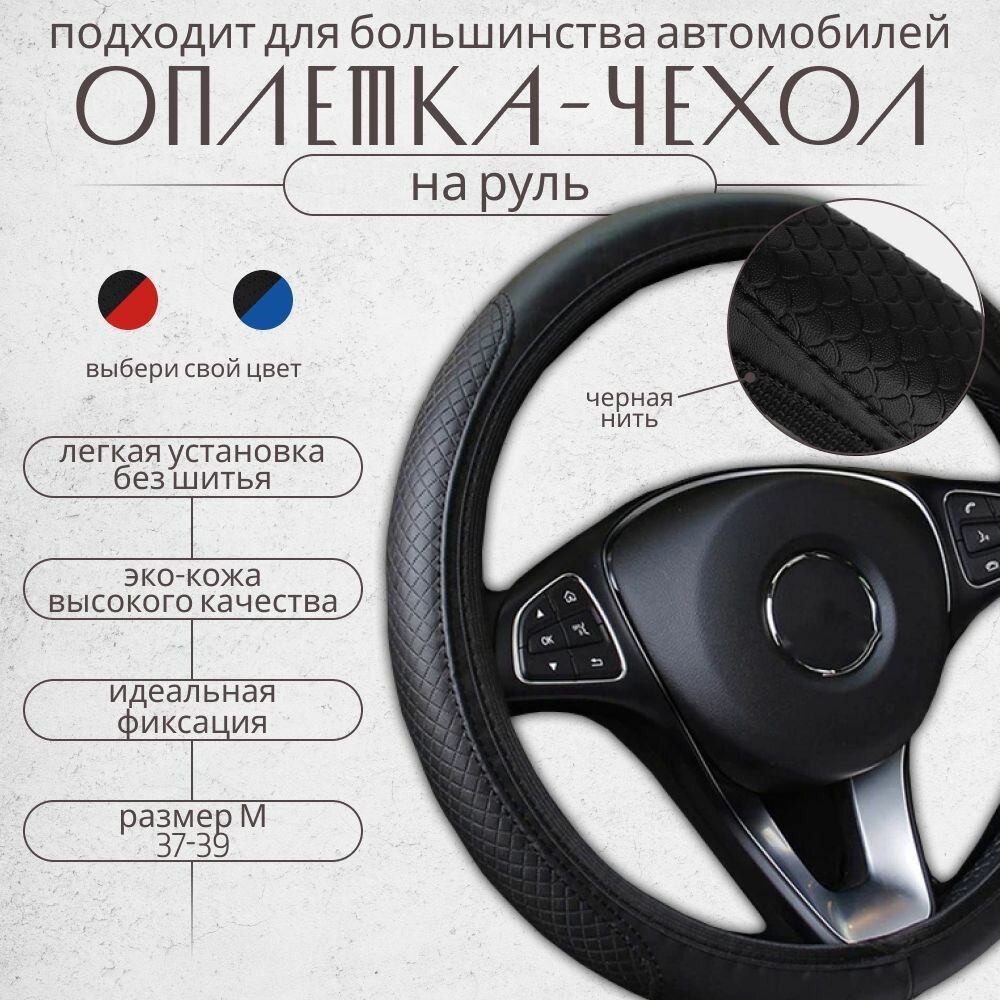 Оплетка на руль 37-39 см эко кожа для автомобиля, чехол на руль универсальный 38см черный информация: