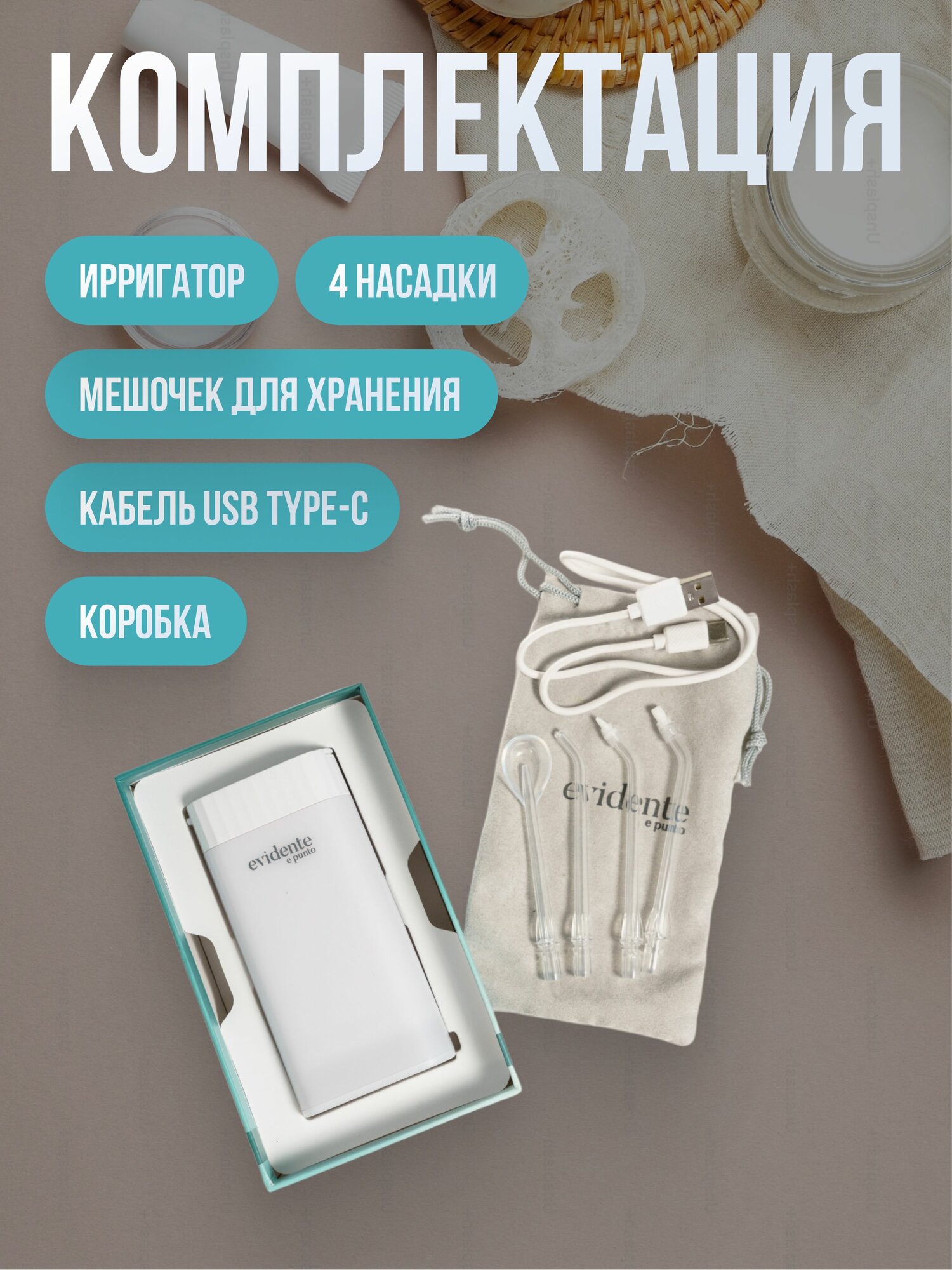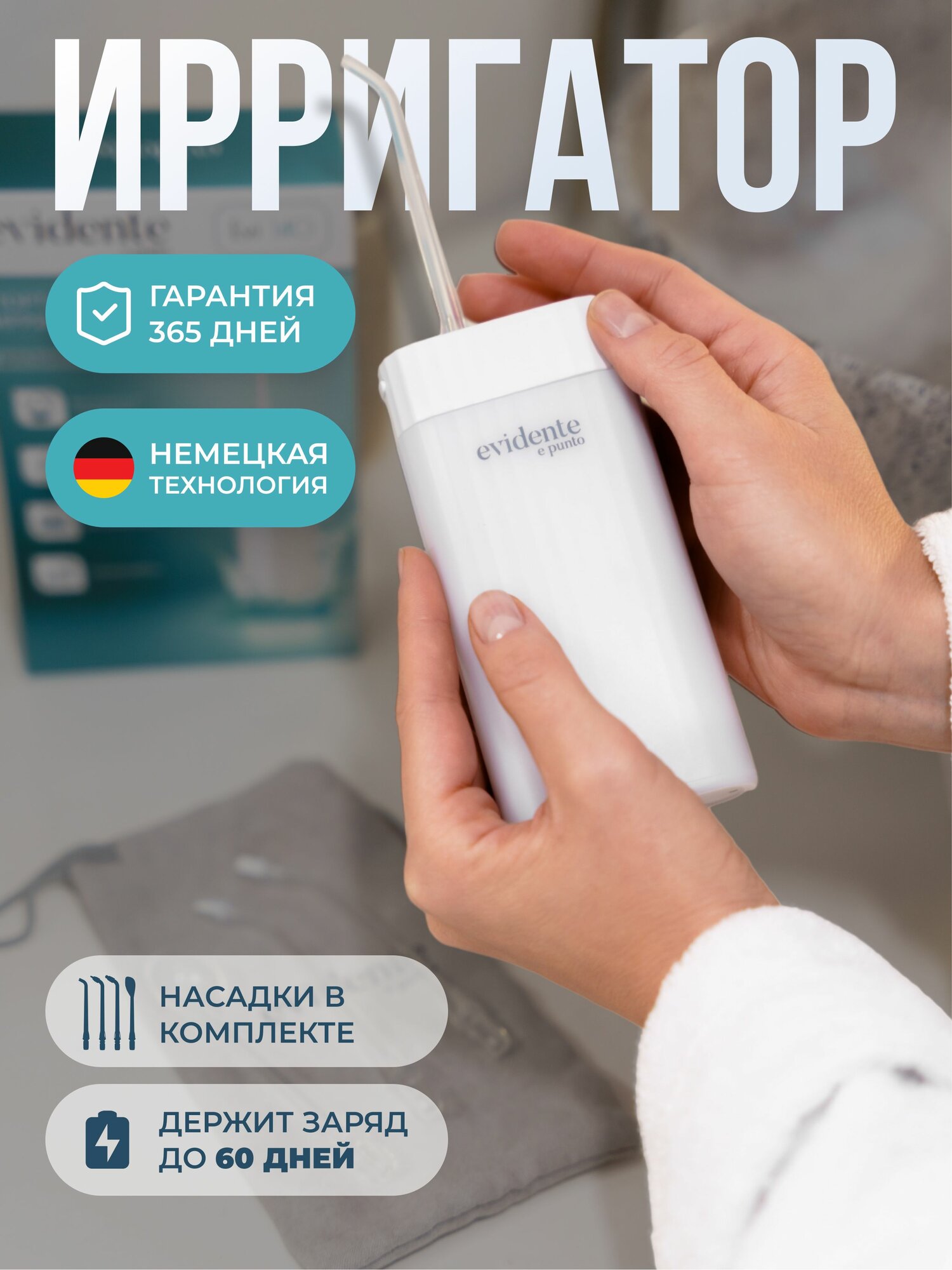Ирригатор для полости рта портативный Evidente, медицинский, беспроводной, 3 режима, насадки, с зарядным устройством, компактный информация:
