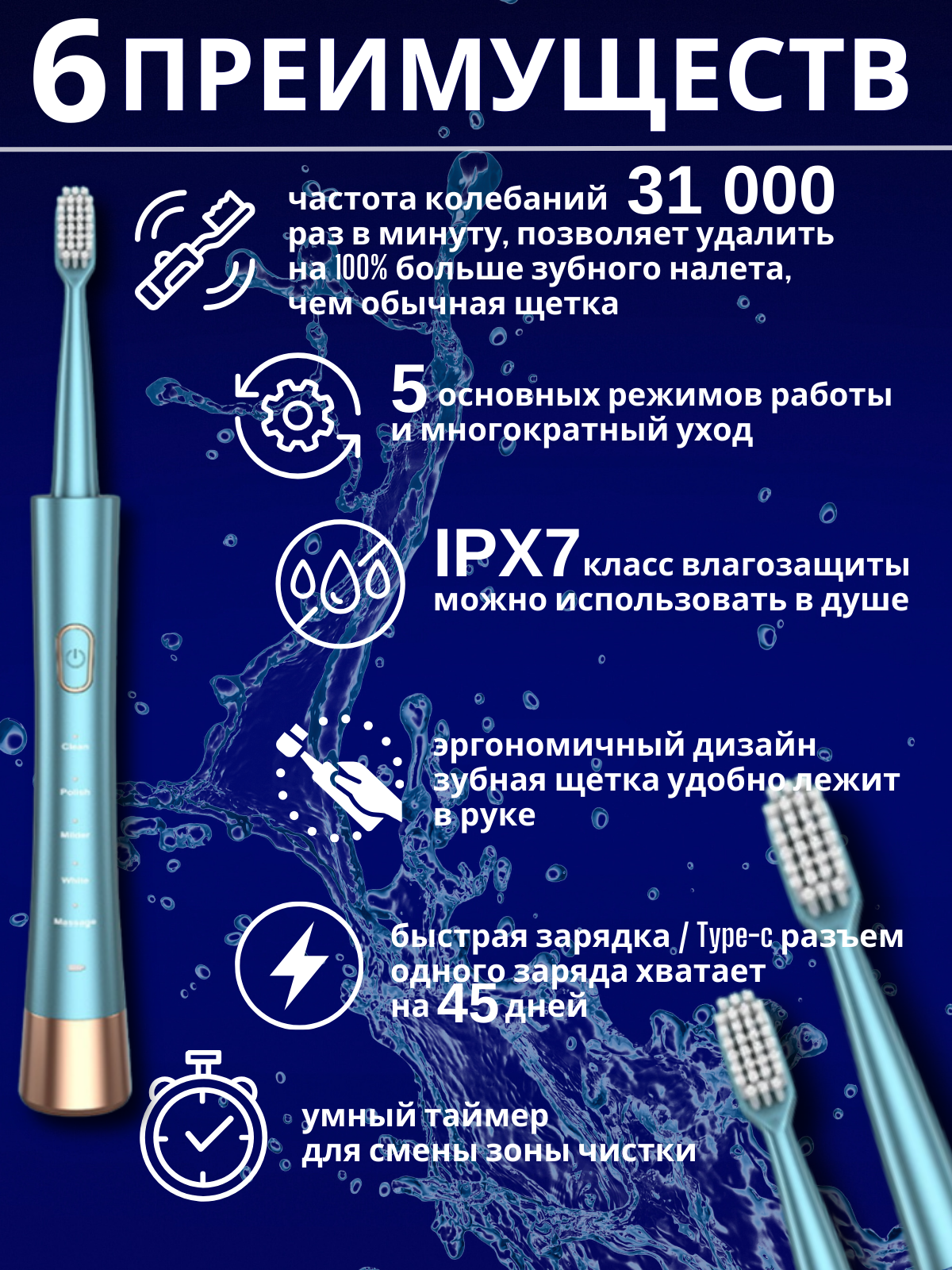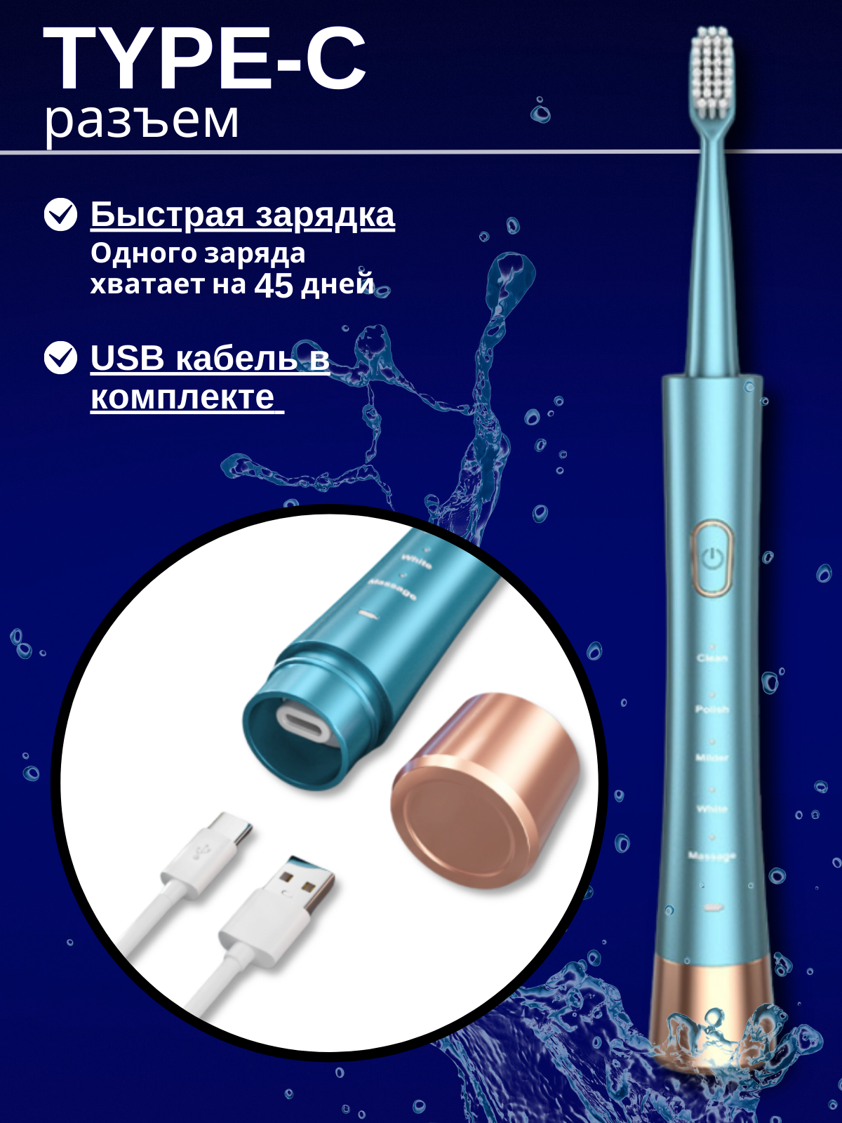 Электрическая зубная щетка Smart Sonic, длительный срок службы, 6 насадок, белый.