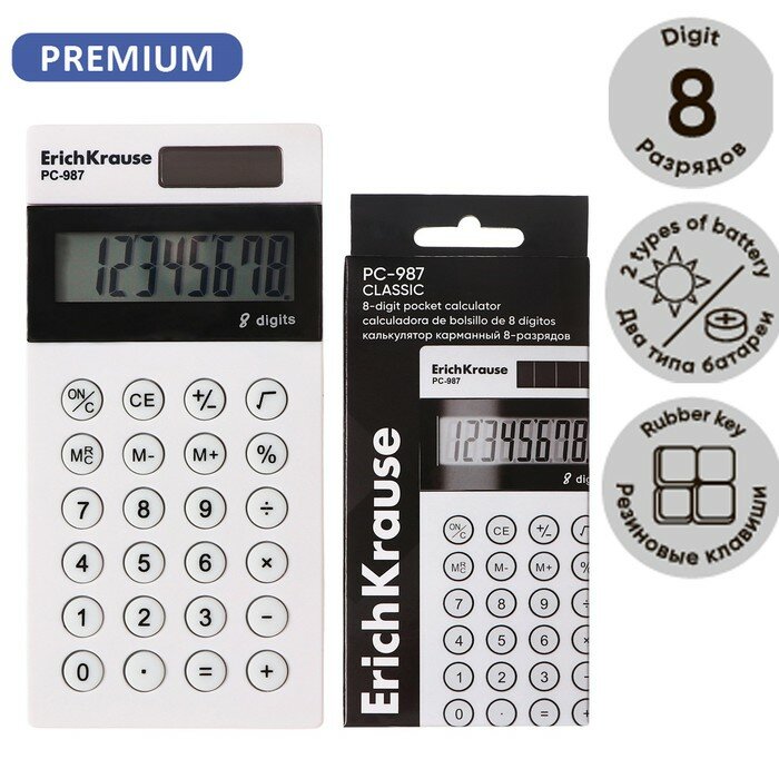 Калькулятор карманный 8-разрядов ErichKrause PC-987 Classic, белый (в коробке по 1 шт.) ErichKrause информация: