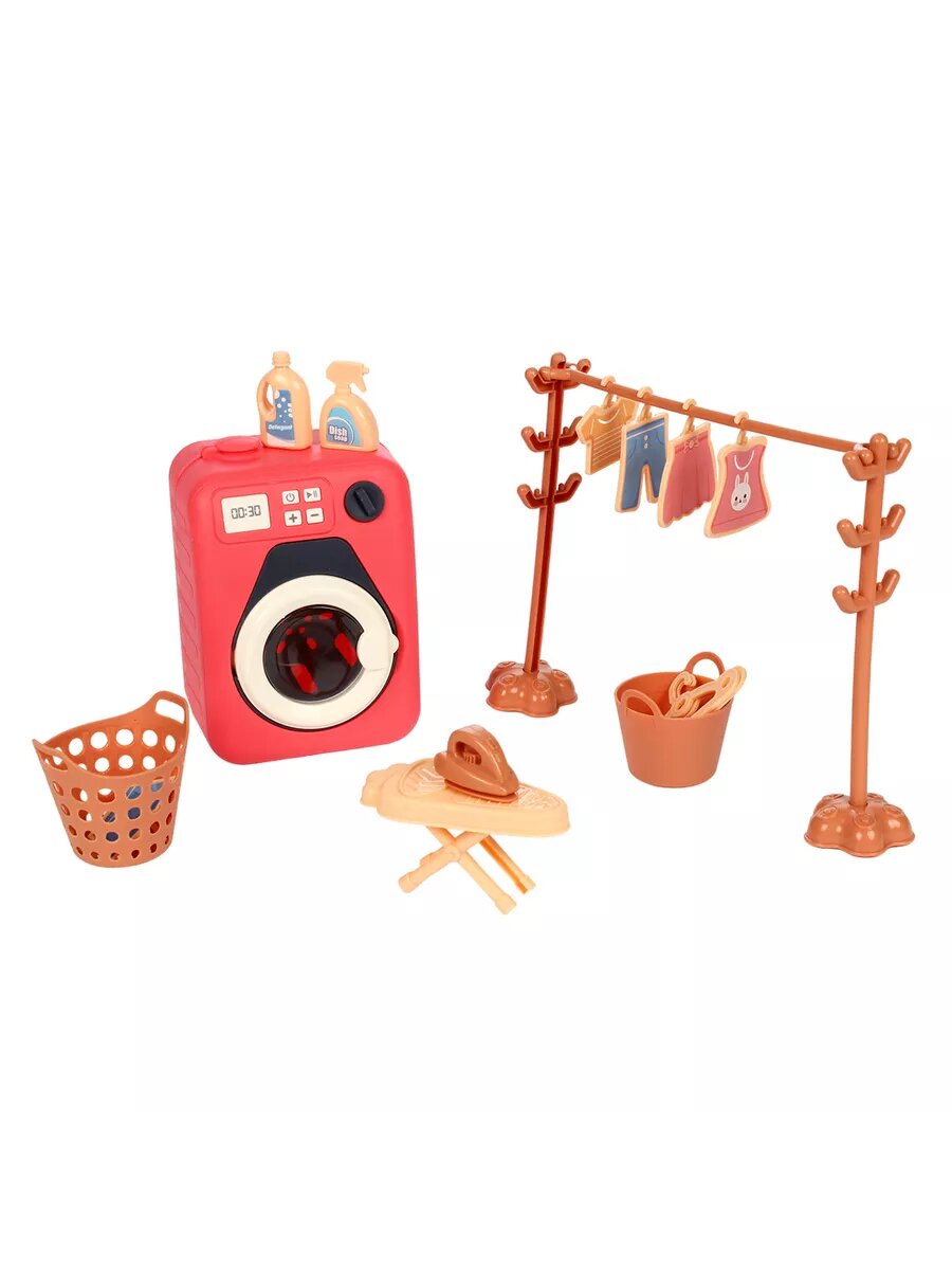 | В комплекте | блендер, гладильная доска, игрушечная еда, корзина для белья, кулер, миксер, мультиварка, посуда, принадлежности для стирки, пылесос, раковина, стиральная доска, стиральная машина, сушилка для белья, тостер, утюг, швейная машина |